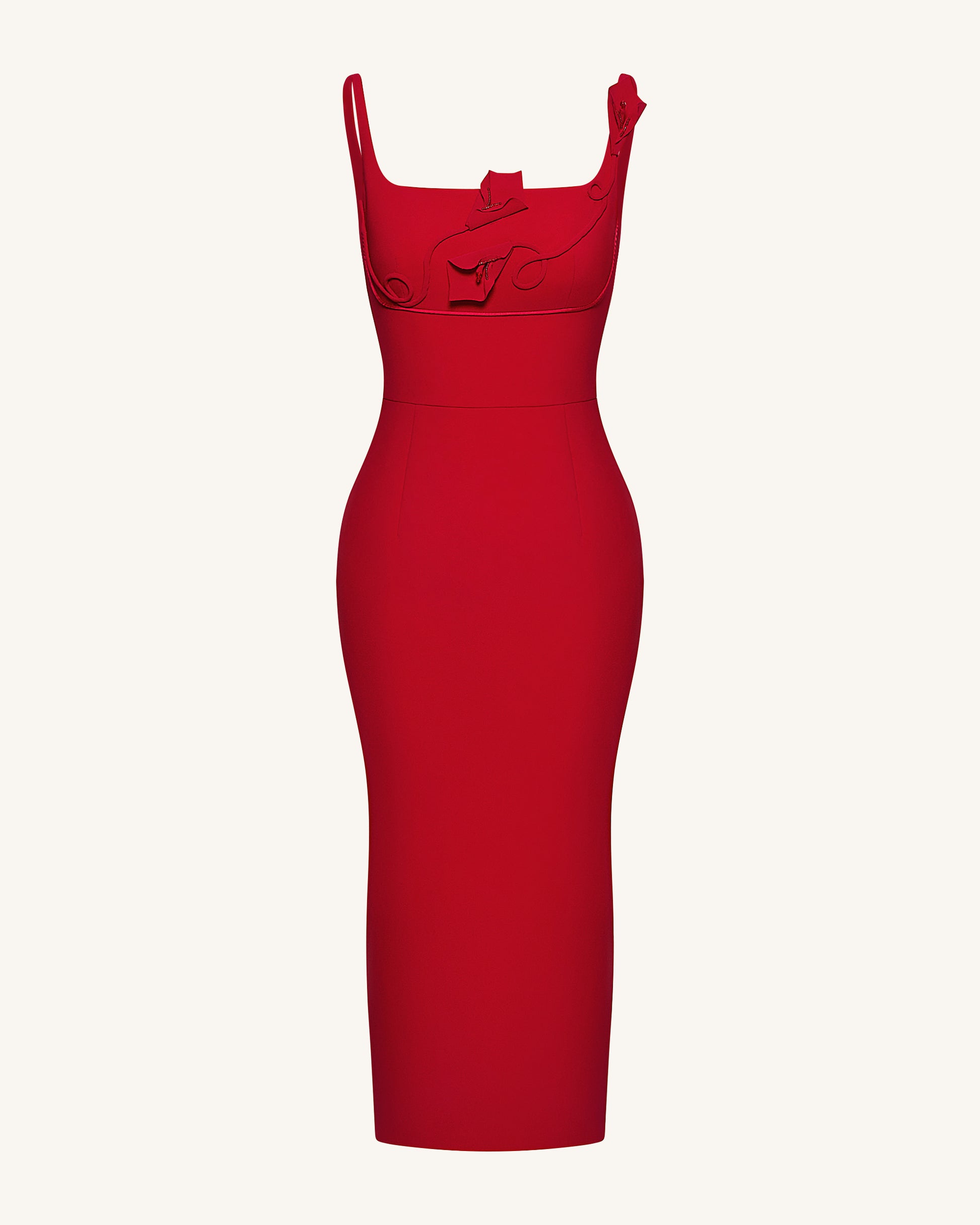 3D Floral Appliqué Square-Neck Sheath Midaxi Dress - Red