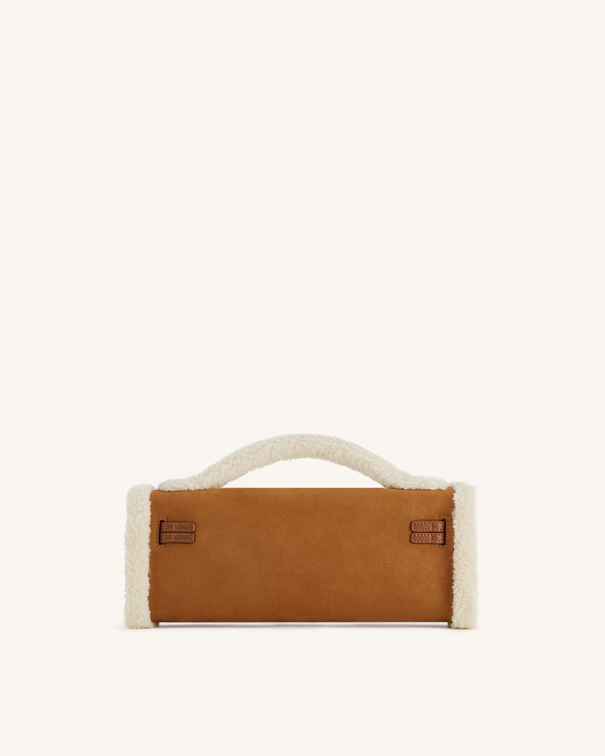 A structured rectangular top handle bag in brown faux suede with shearling trim. Finished with gold-tone hardware and a secure twist lock. Compact, cozy, and chic.