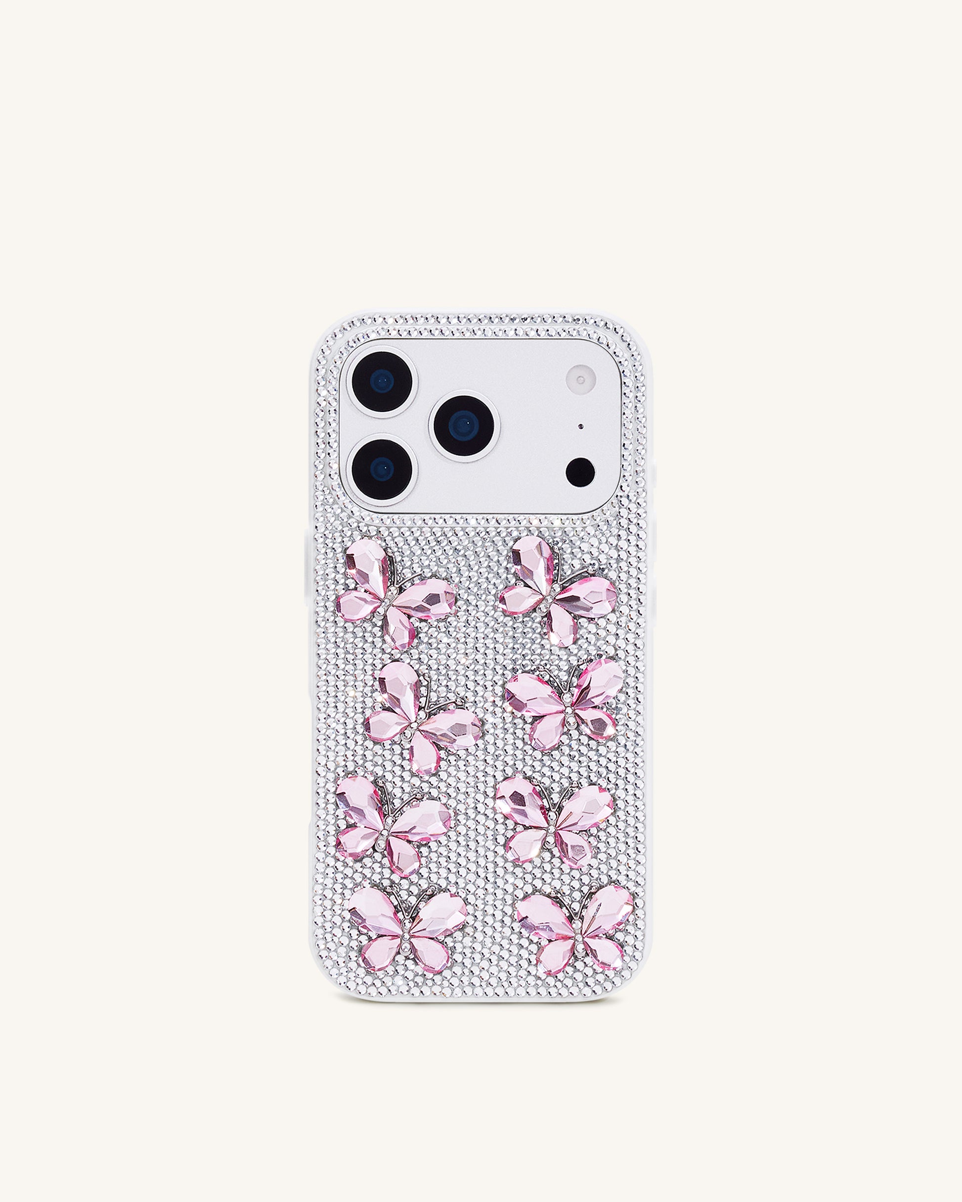 This phone case features a white crystal design adorned with 3D pink crystal butterflies. Fully embellished for a sparkling effect, it offers basic protection, enhanced grip, and serves as a stylish, decorative accessory.Each phone case is handmade, so slight variations in craftsmanship may occur with every product.