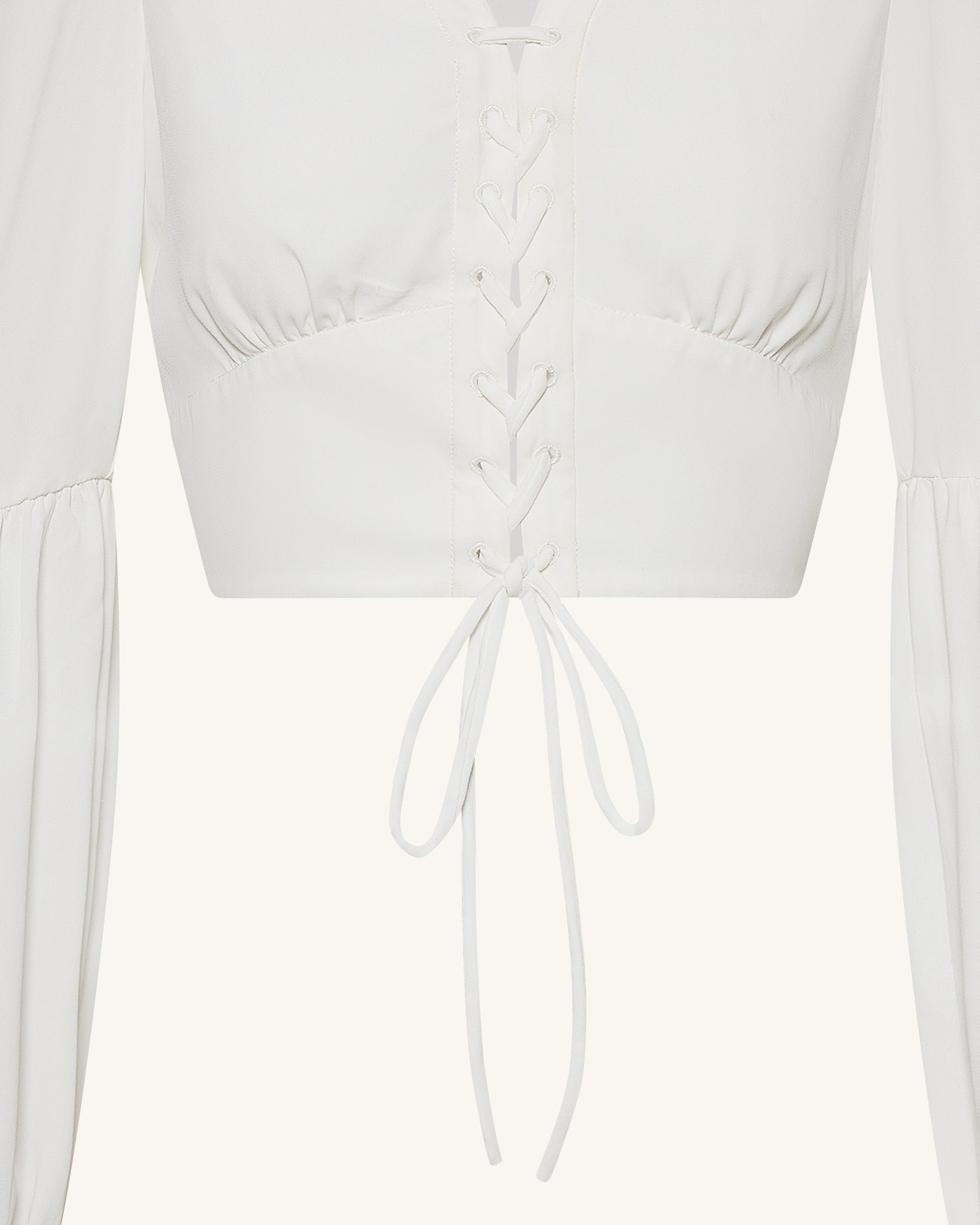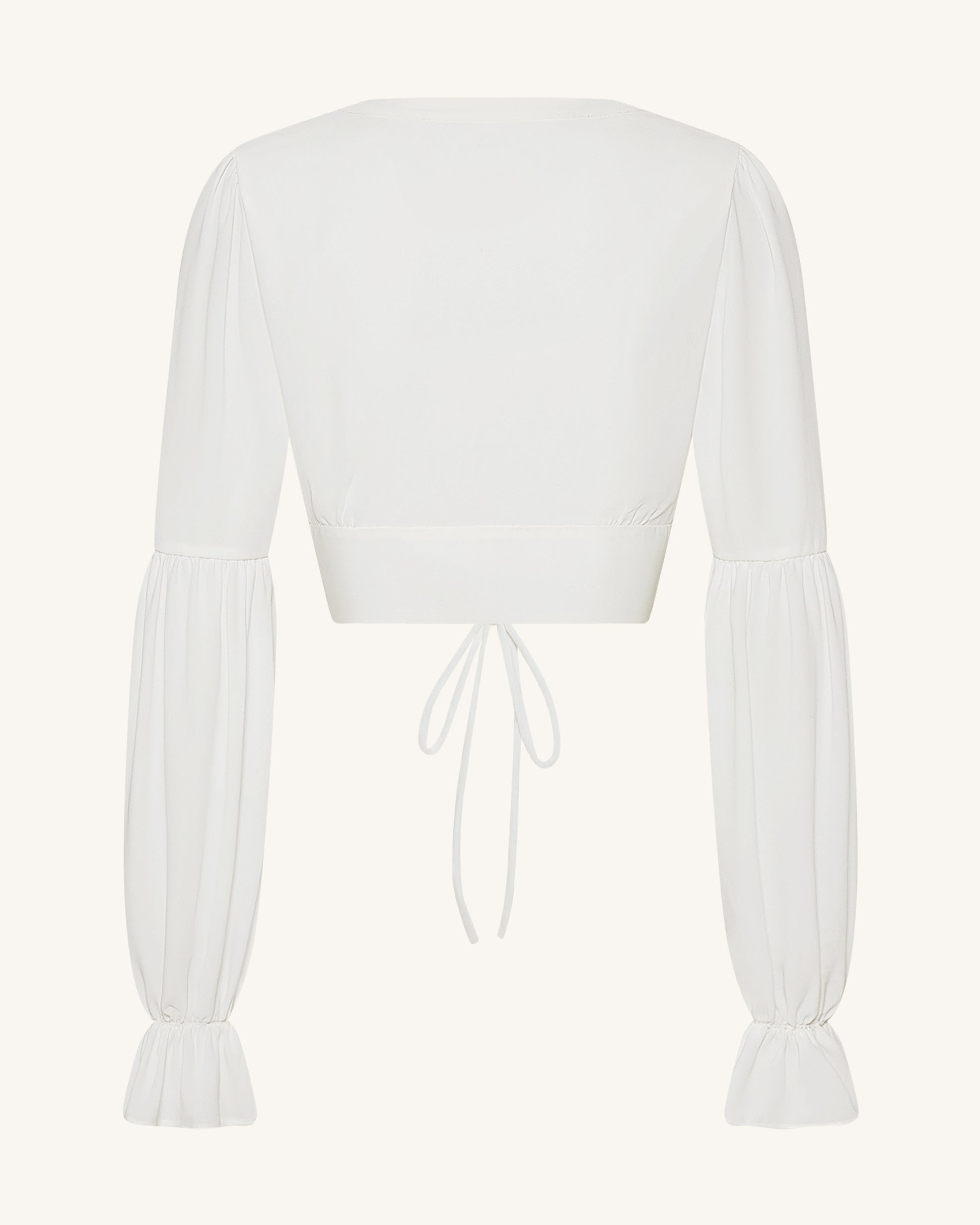Chiffon Lantern-Sleeve Tie-Front Cropped Blouse - White