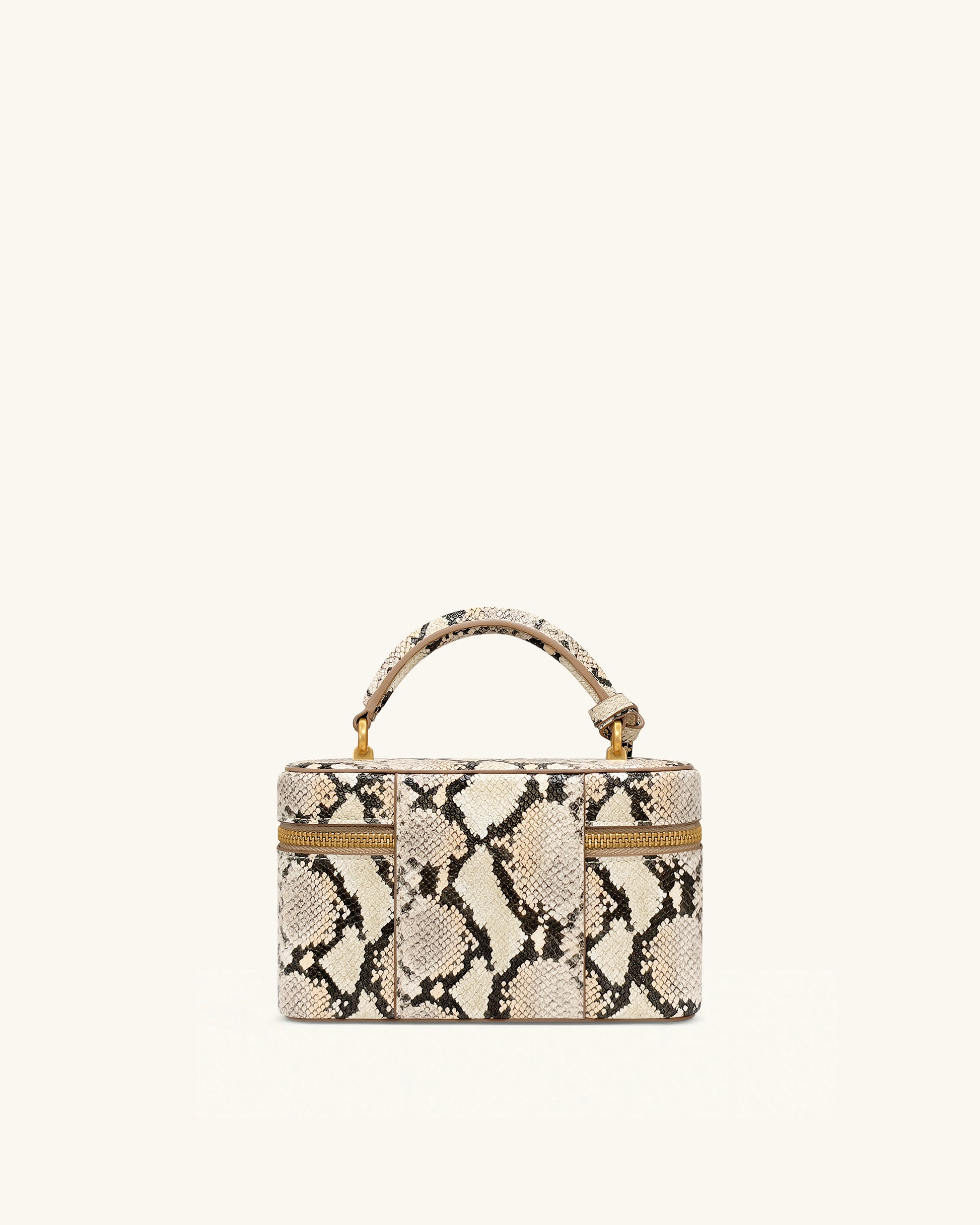 Cleo Snake-Embossed Box Shape Top Handle Bag - Beige