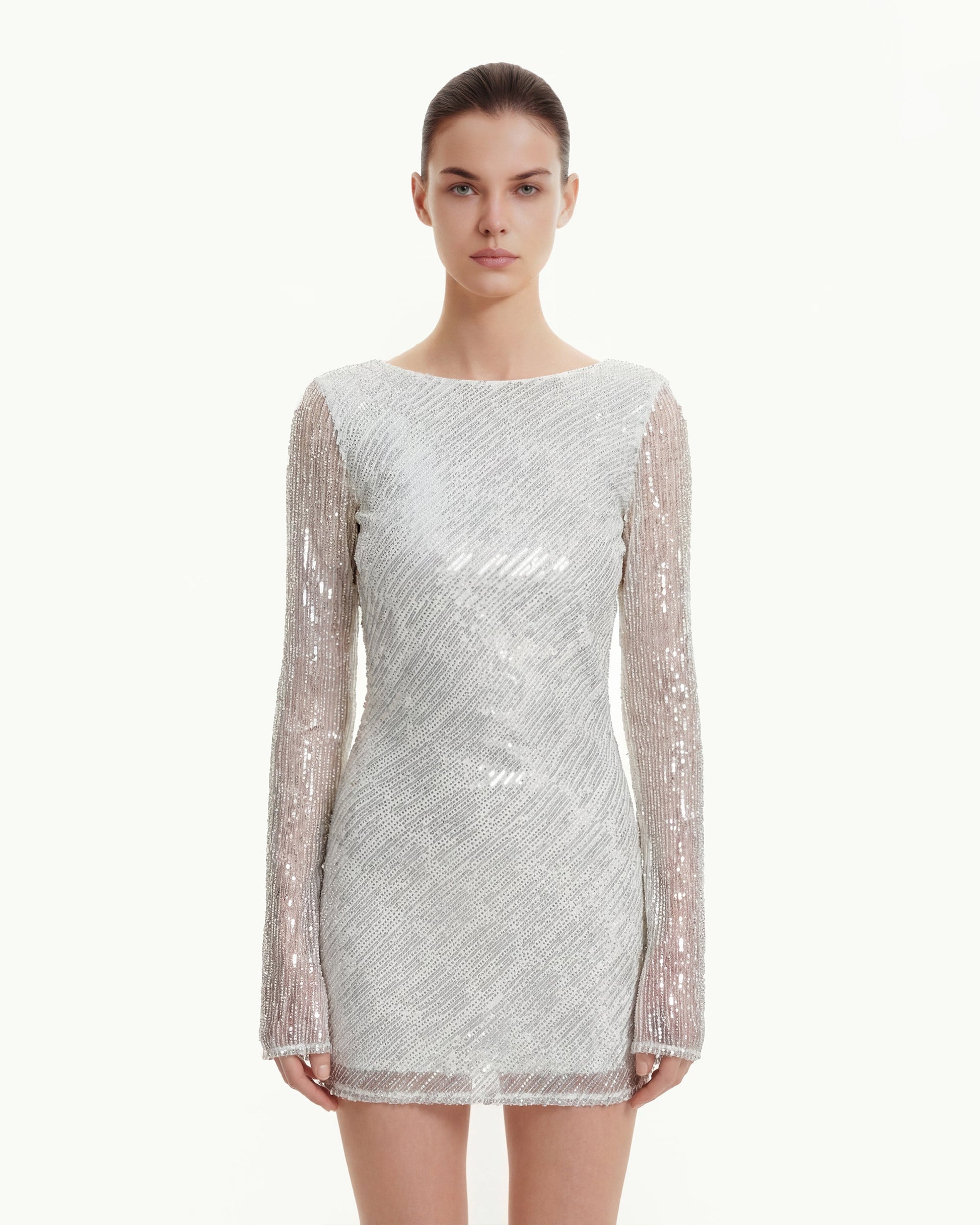 Diagonal Sequin Open-Back Long Sleeve Mini Dress - White