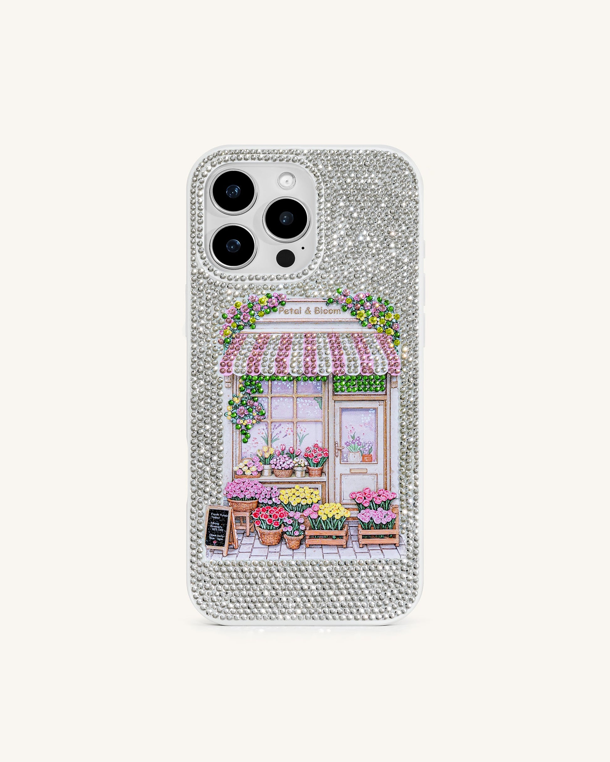 This phone case features a sparkling artificial crystal background with a charming flower shop illustration. It offers basic protection, added grip, and brings a romantic, vintage-inspired touch to your phone.Each phone case is handmade, so slight variations in craftsmanship may occur with every product.