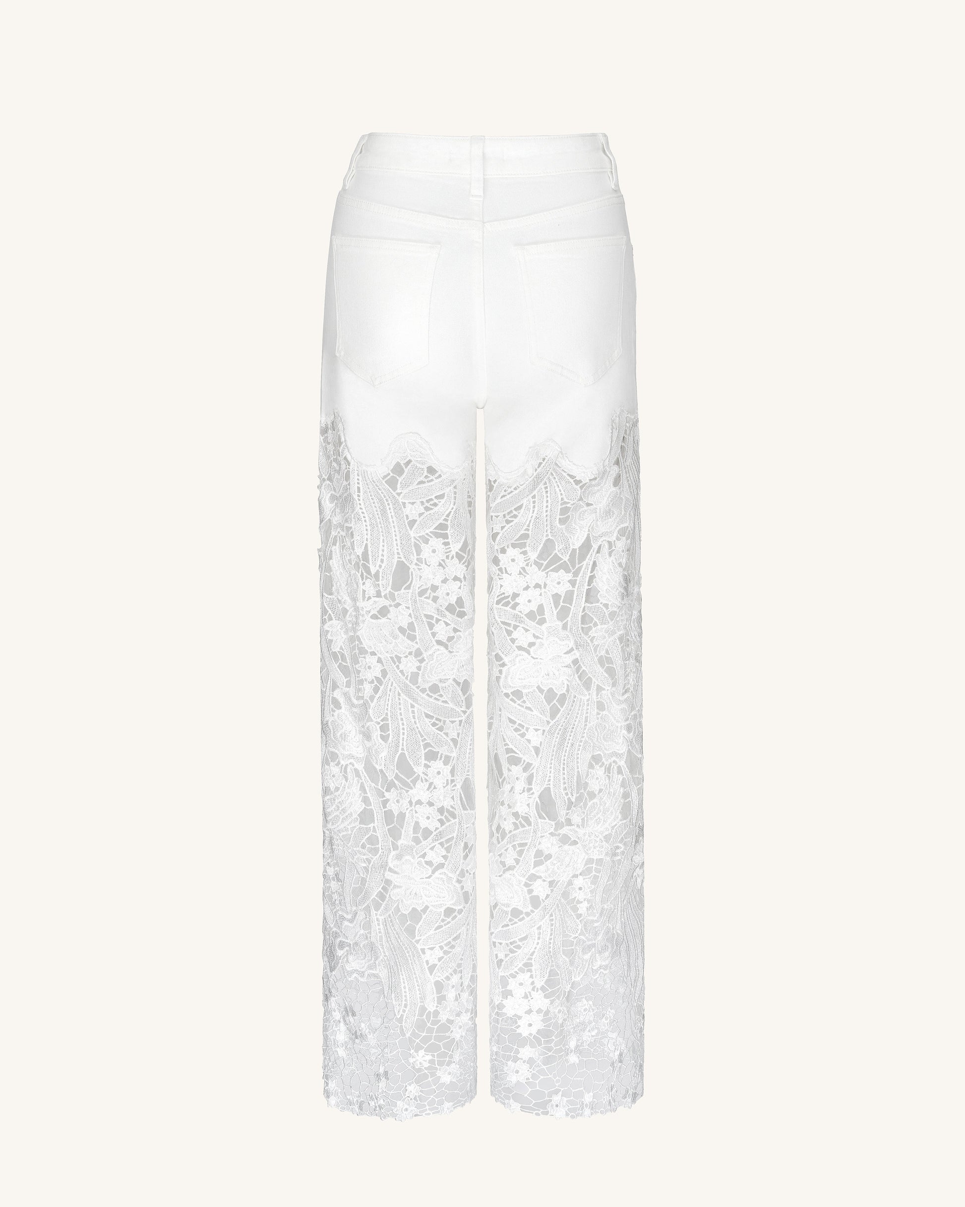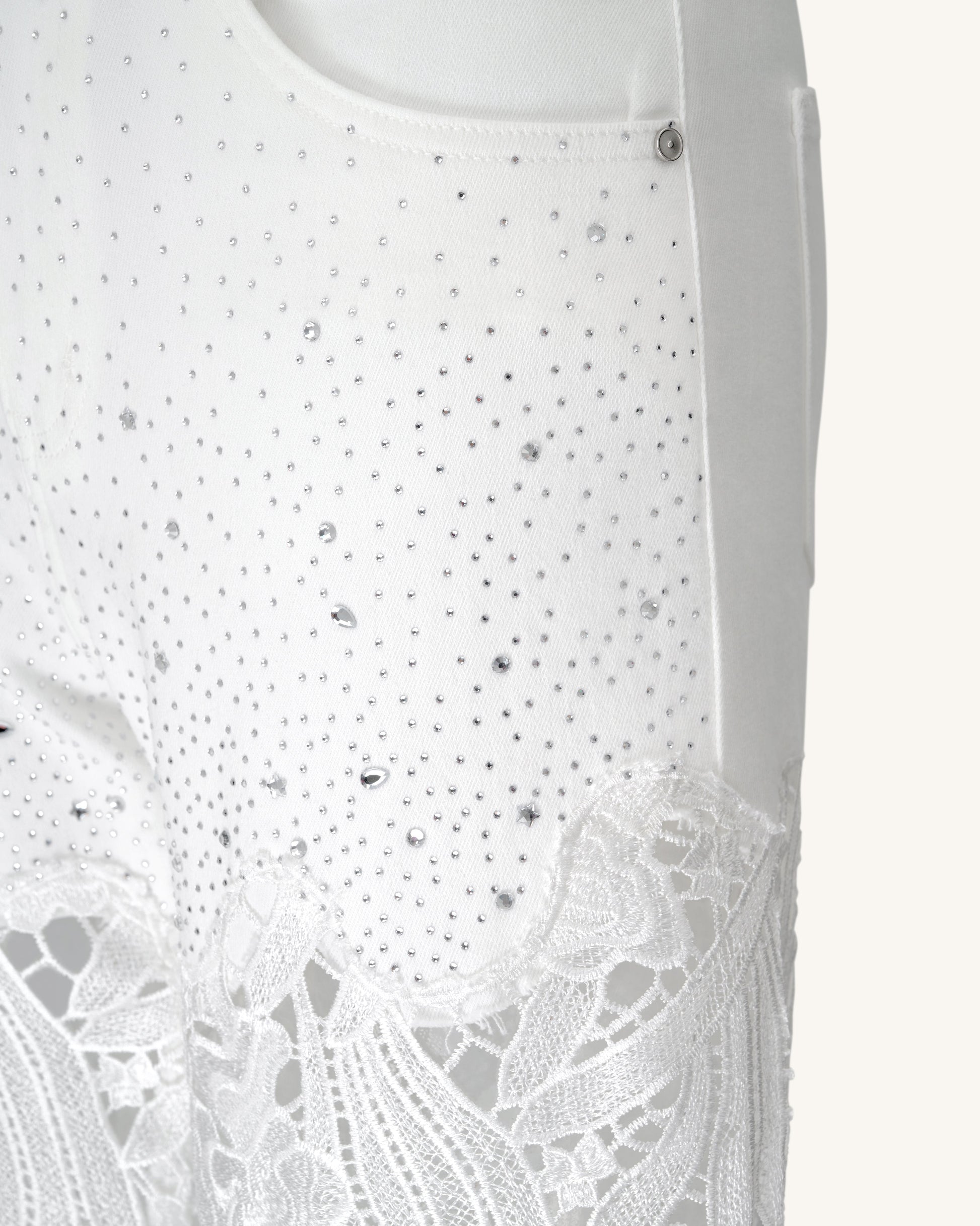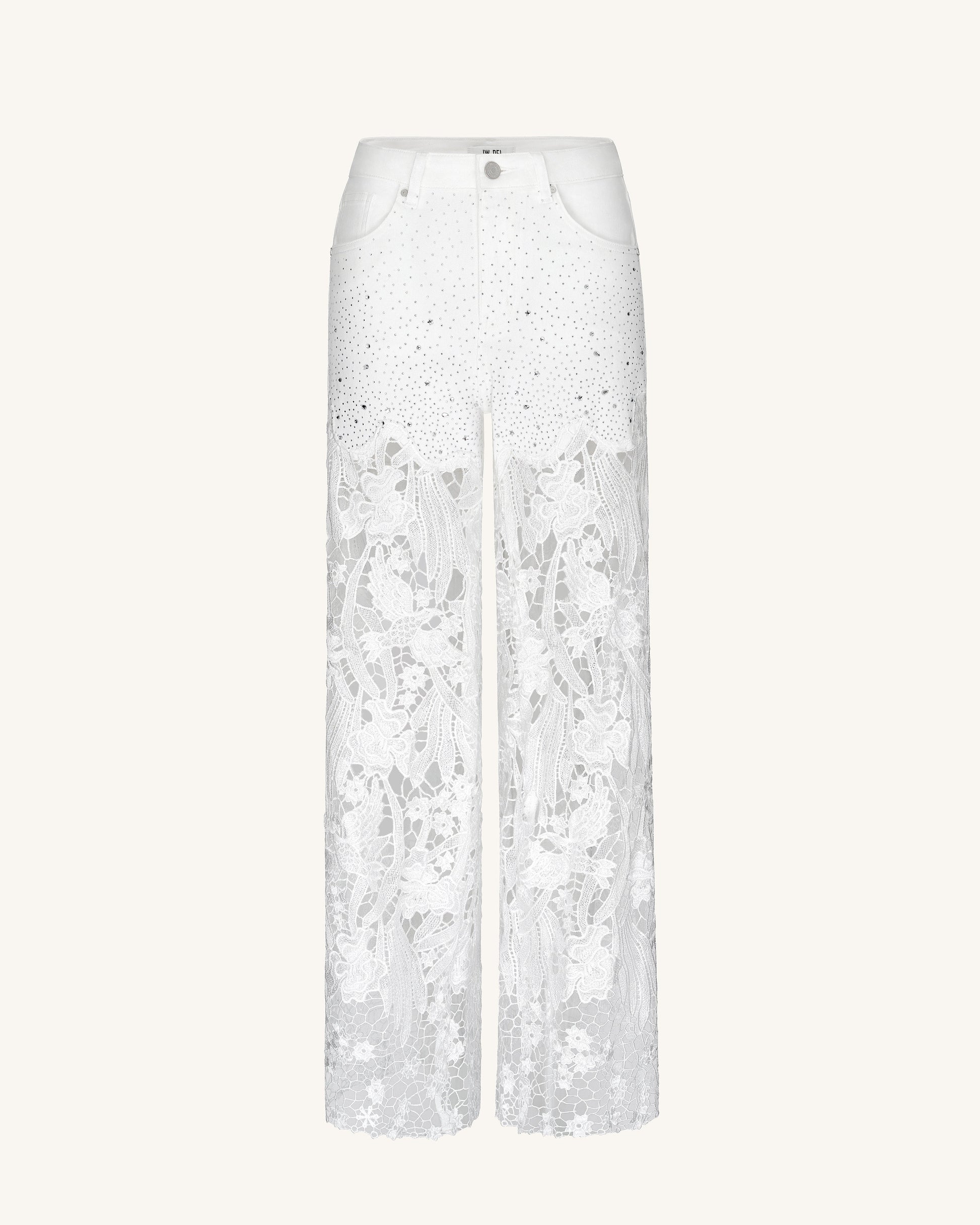 Embroidery High Rise Wide Leg Lace Denim Jeans With Rhinestone - White