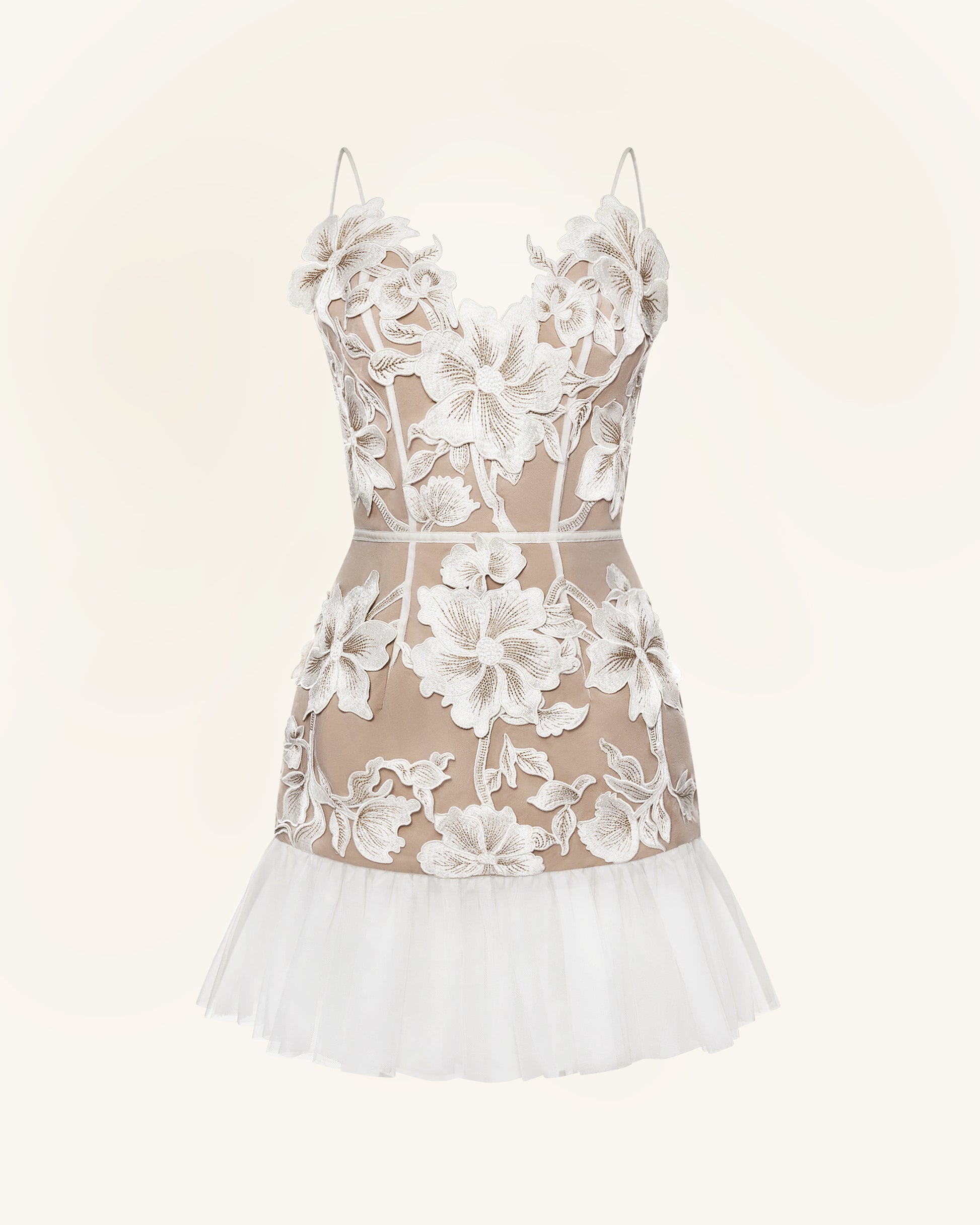 Elegance meets romance in this sheer mesh mini dress adorned with intricate 3D floral embroidery. Featuring a nude-tone base and delicate white blossoms throughout, the fitted bodice and flounced hem create a flattering silhouette. Perfect for date nights, bridal events, or any occasion where you want to feel truly special.