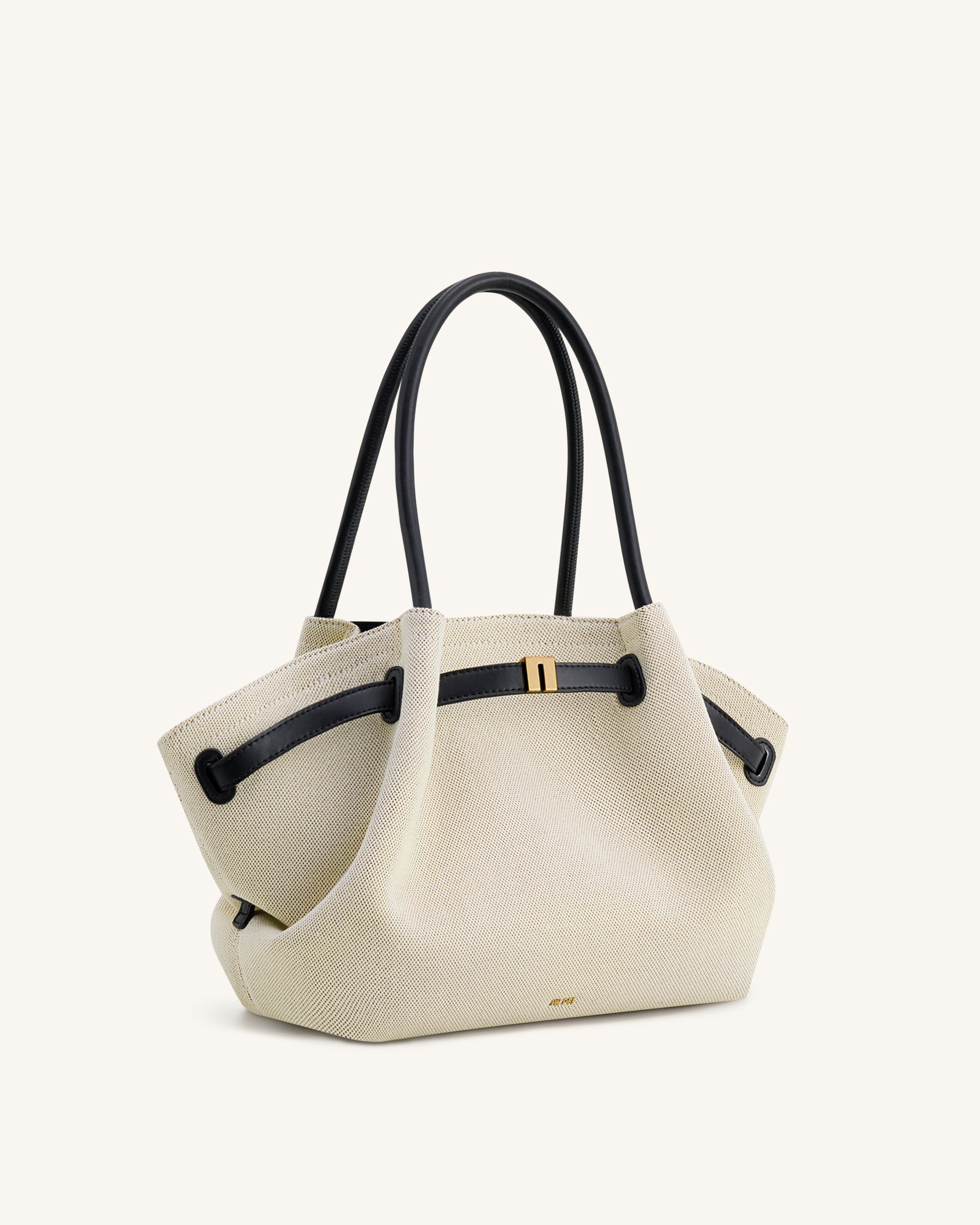 This trapezoid tote bag features a textured cream canvas body paired with sleek black handles and trim details. Designed with an open-top silhouette and gold-tone accent, it offers a minimalist yet sophisticated look—perfect for work, brunch, or everyday errands.
