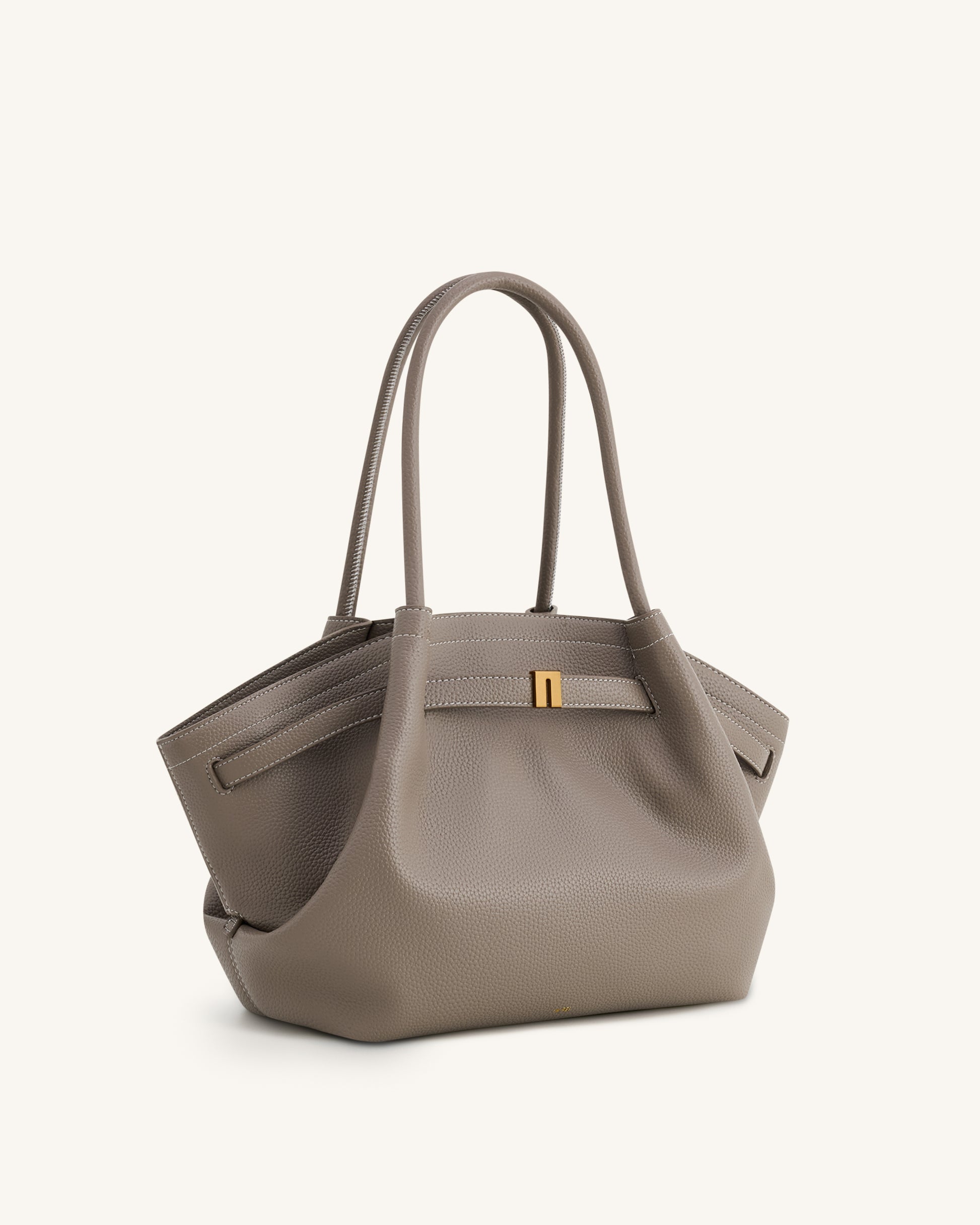 This trapezoid tote bag in taupe grey features a structured yet soft silhouette with a pebbled texture and contrast stitching. Designed with elongated handles and a gold-tone accent, it offers timeless elegance and spacious functionality—ideal for daily use or commutes.