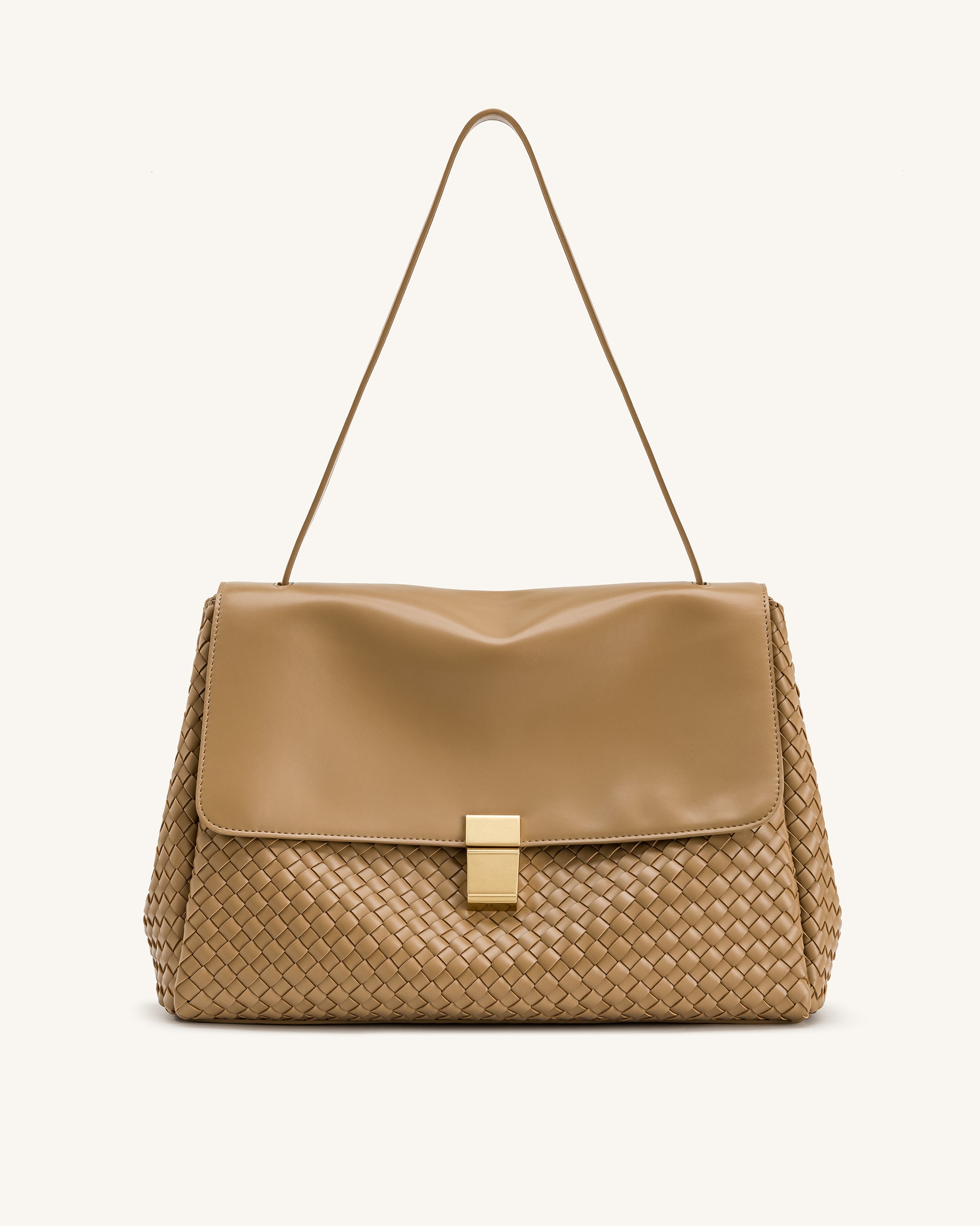 This elegant shoulder bag features a soft faux leather flap and a woven texture base in a warm camel tone. Designed with a structured silhouette, gold-tone clasp, and slender strap, it blends modern refinement with classic craftsmanship.