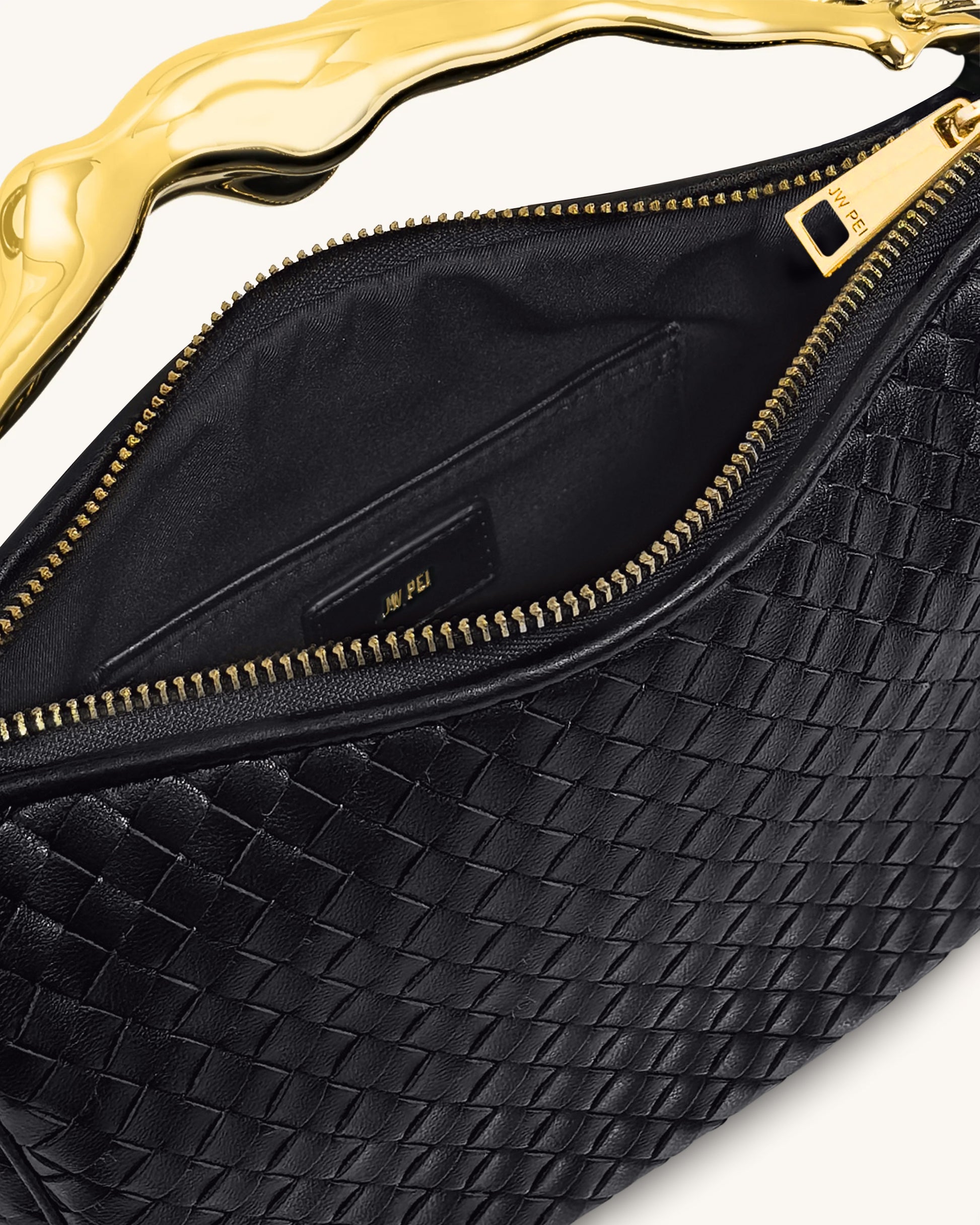 This handbag features a sculptural gold-tone metal handle in the shape of a reclining human figure, paired with a sleek jet black woven body. Its compact silhouette and refined details combine artistic flair with modern sophistication, making it a striking accessory for any occasion.