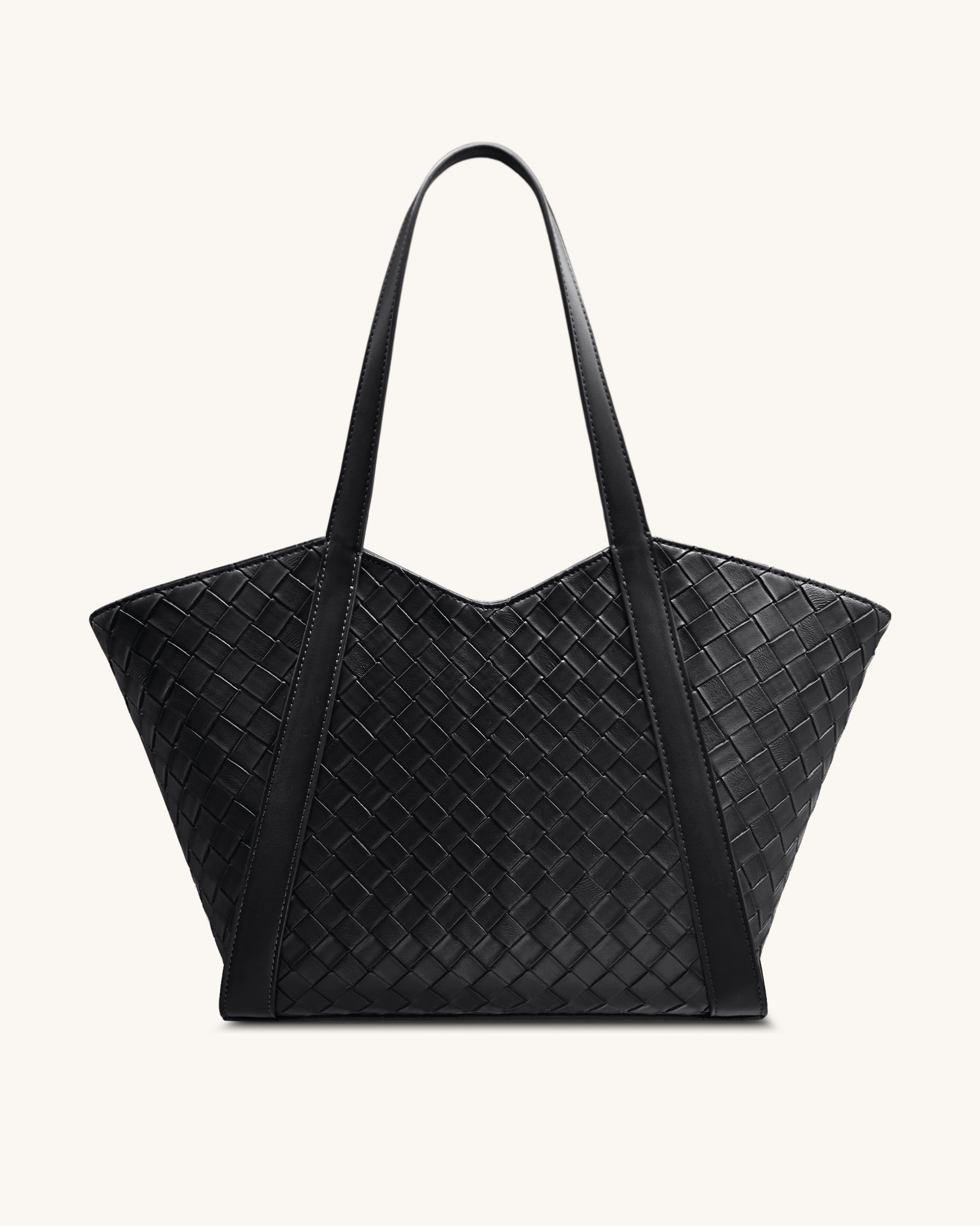 This oversized black tote bag features a sleek trapezoid silhouette with a faux woven texture for added visual depth. The wide shoulder straps and spacious interior make it an ideal choice for commuting, shopping, or travel—combining practicality with modern style.