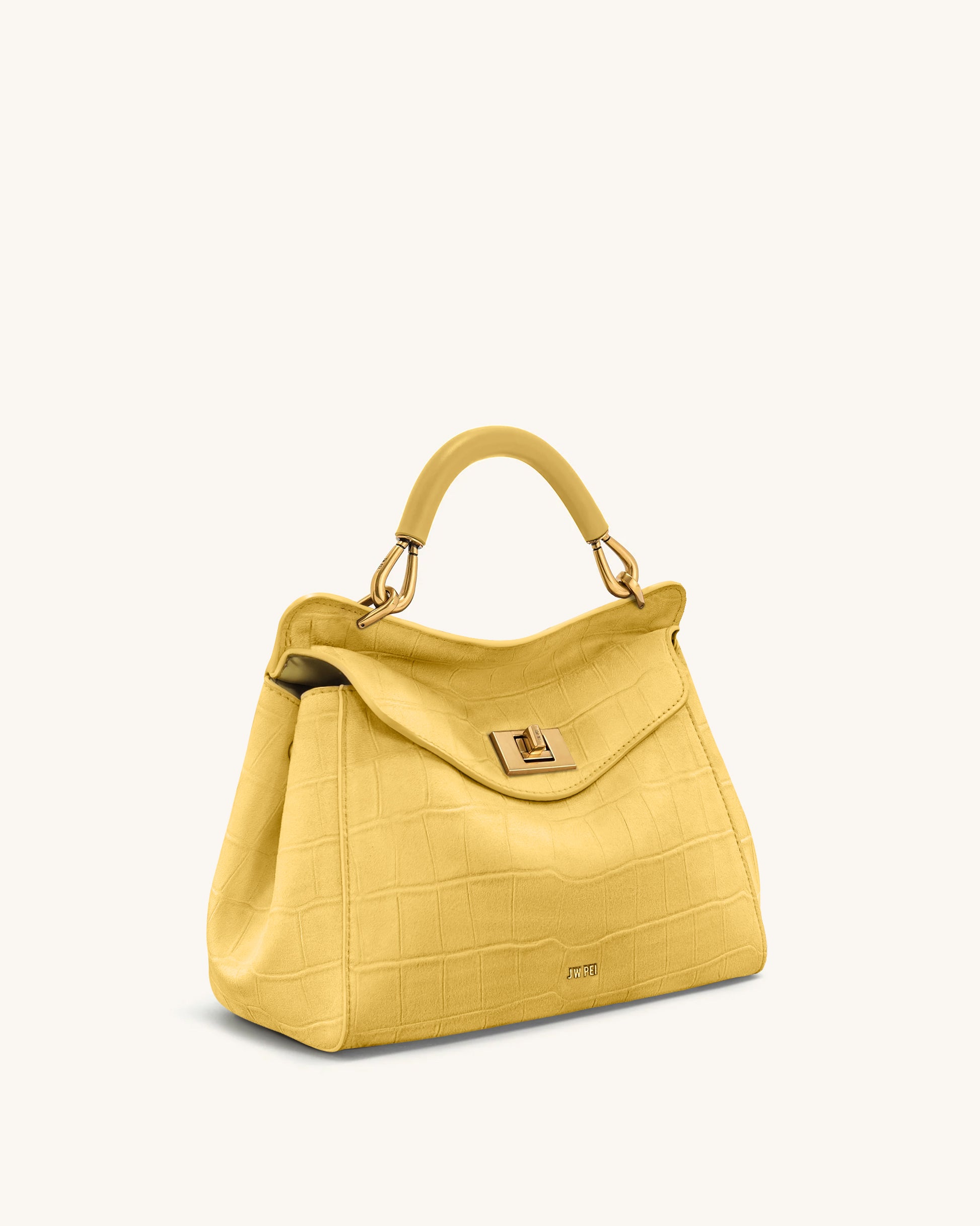 This statement top-handle bag features a soft crocodile-embossed suede texture in a warm yellow hue. Accented with a gold-tone twist-lock, structured handle, and detachable crossbody strap, it blends vintage charm with modern versatility—perfect for elevating everyday outfits.