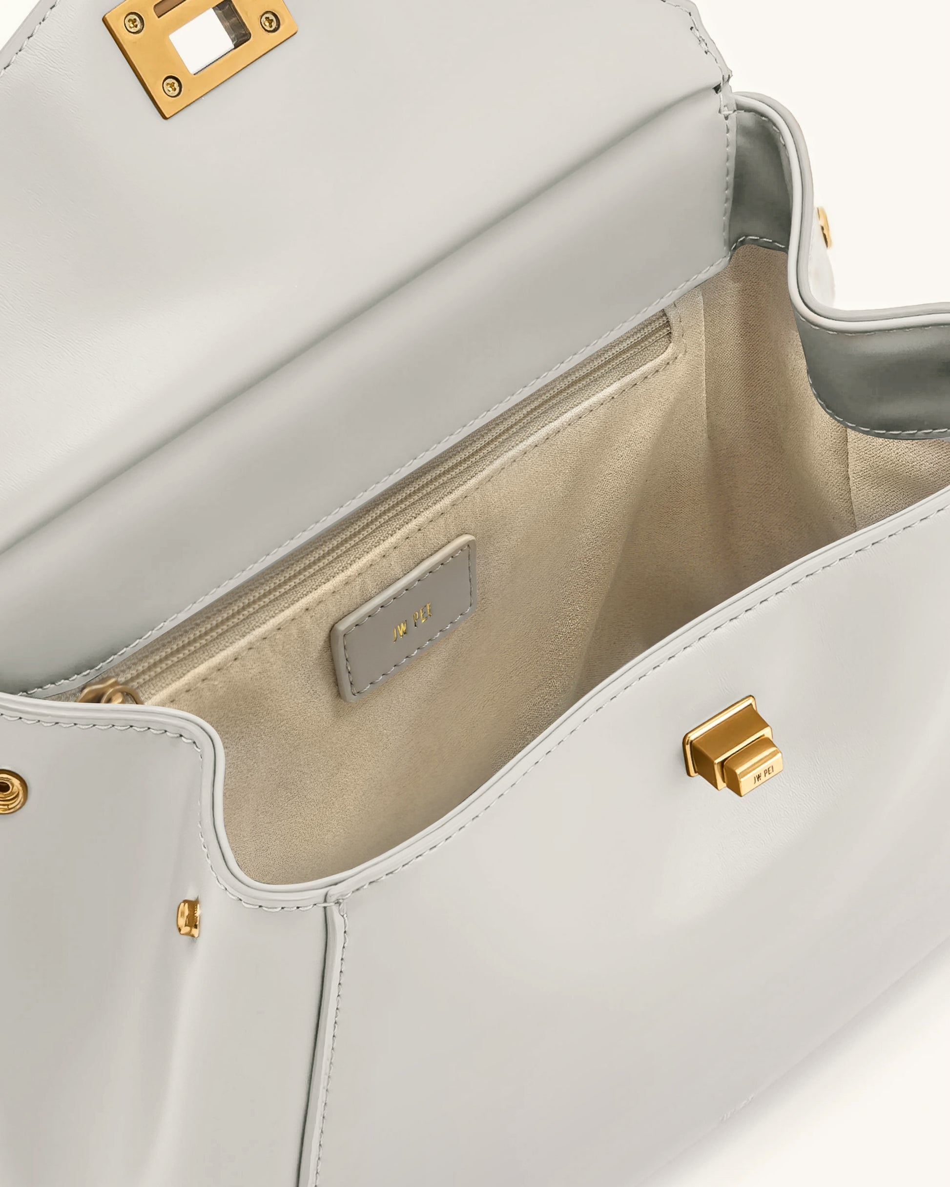 This elegant top-handle bag in a light grey tone features a smooth, polished finish with a softly structured silhouette. Accented with a gold-tone twist-lock closure, sturdy handle, and detachable crossbody strap, it's a versatile piece that complements both casual and refined looks.