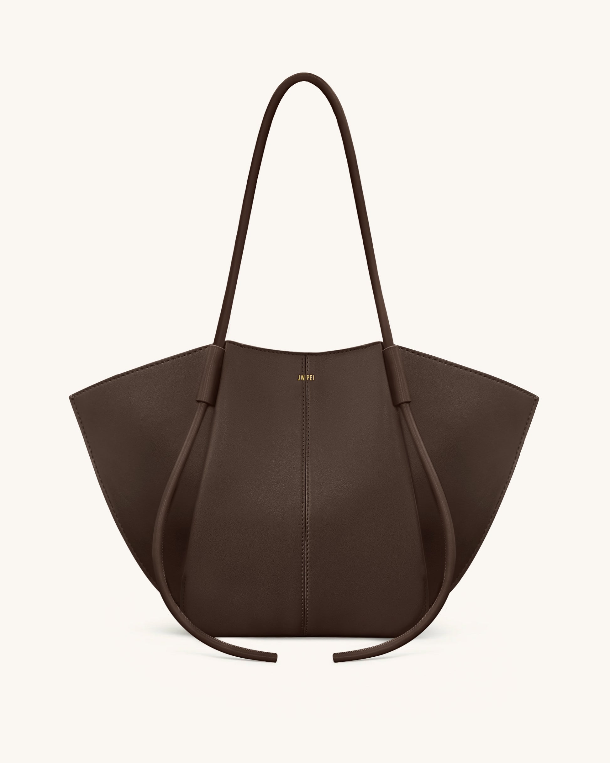 Unique winged silhouette, smooth vegan leather, elegant and modern. Spacious and versatile for daily use.