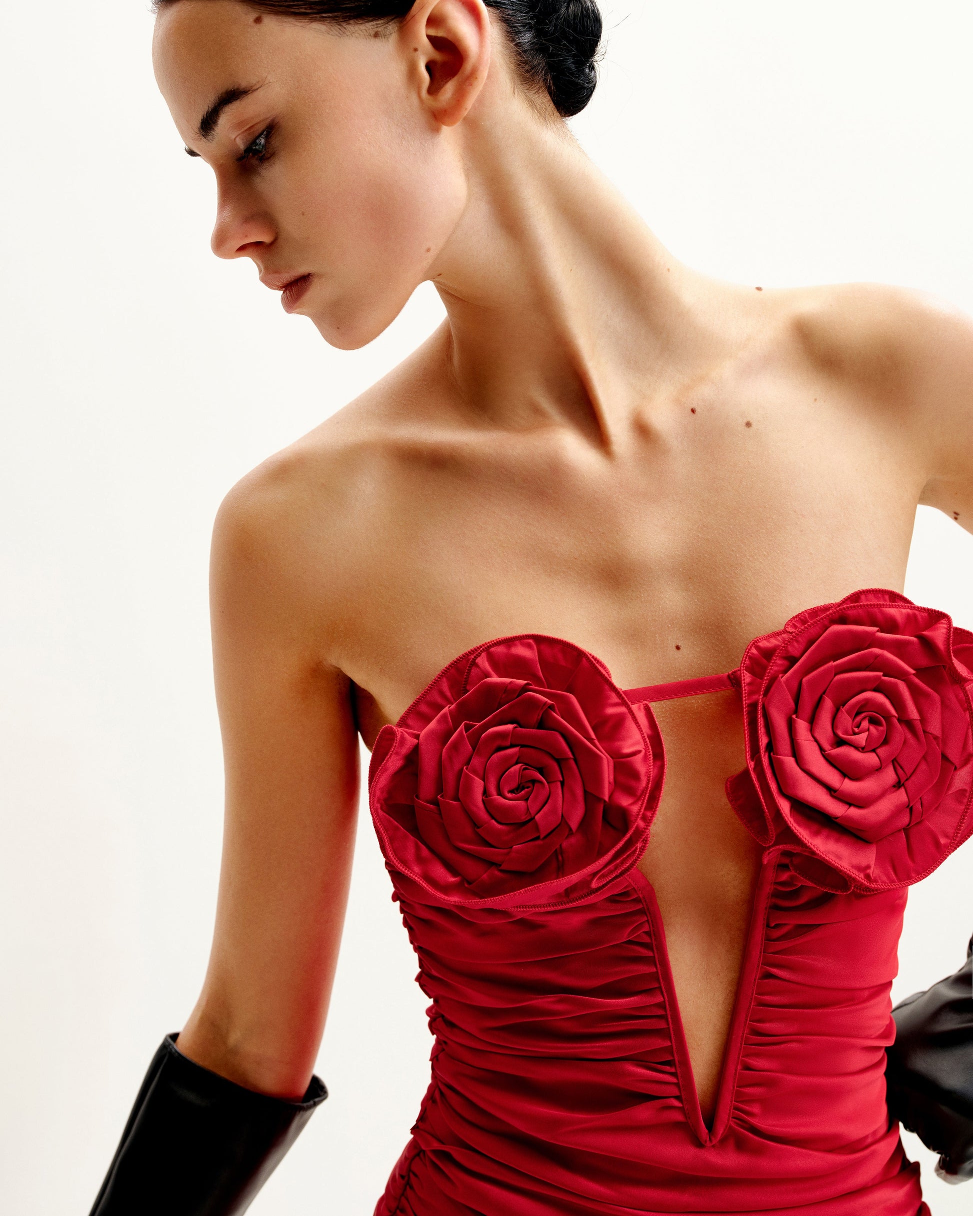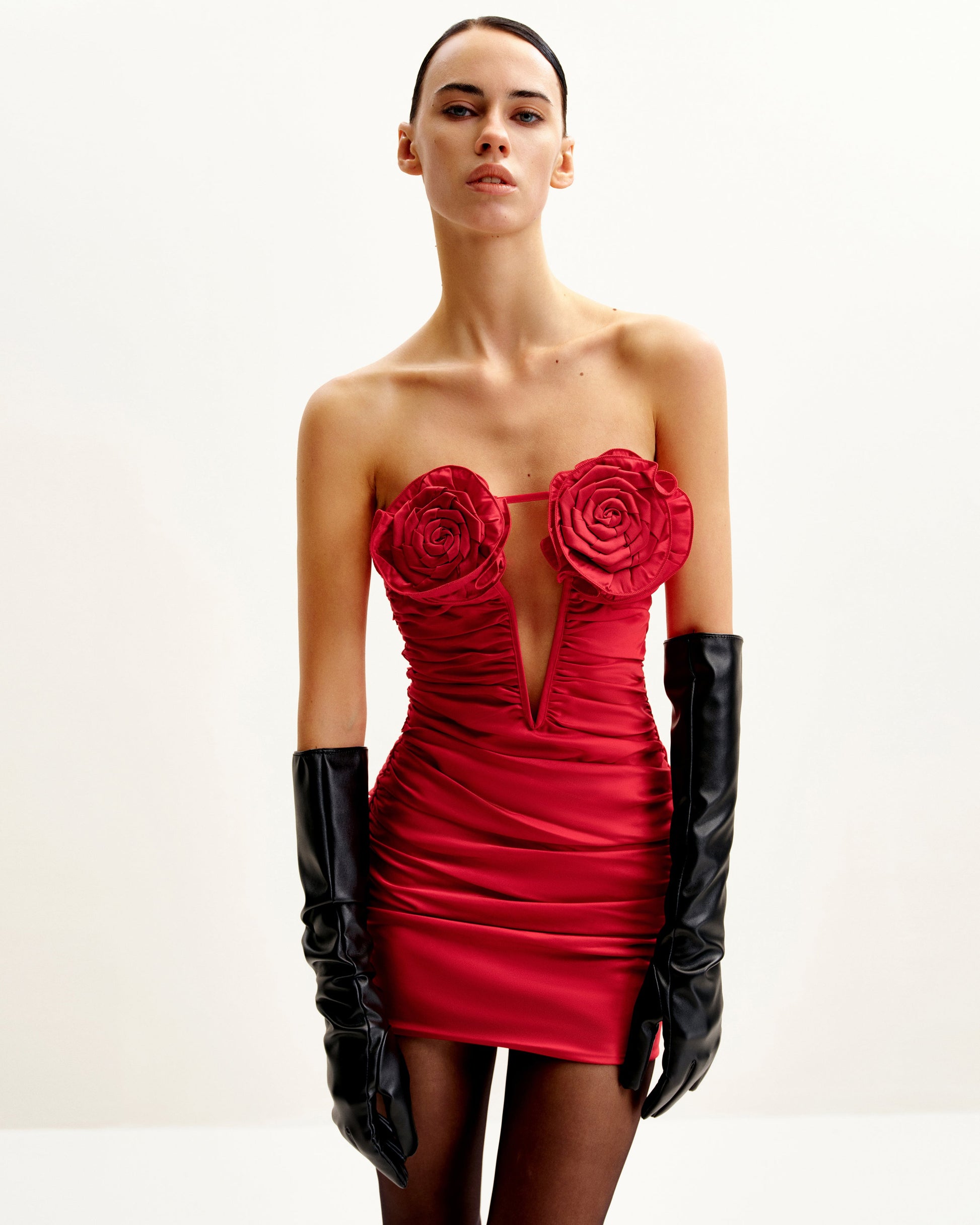 Bailee Red Floral Applique And Ruched Tube Mini Dress - Red