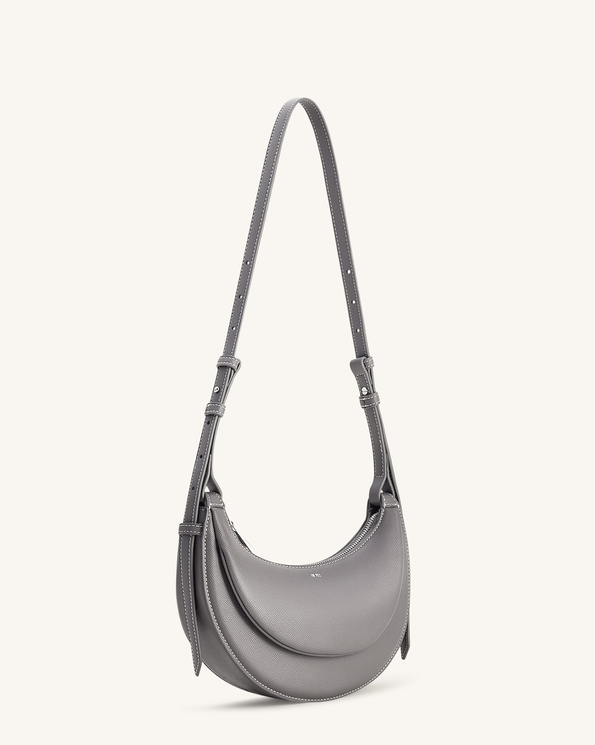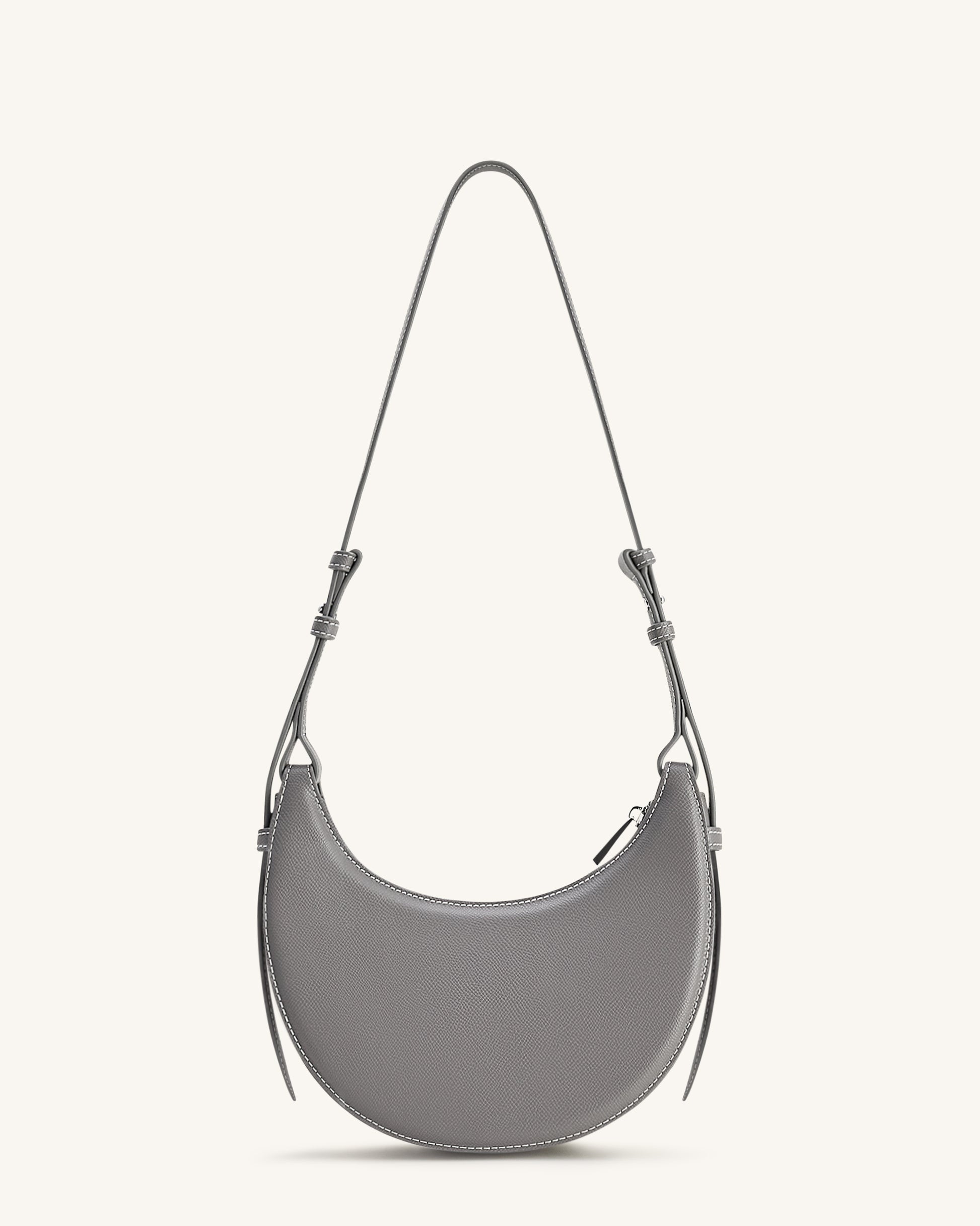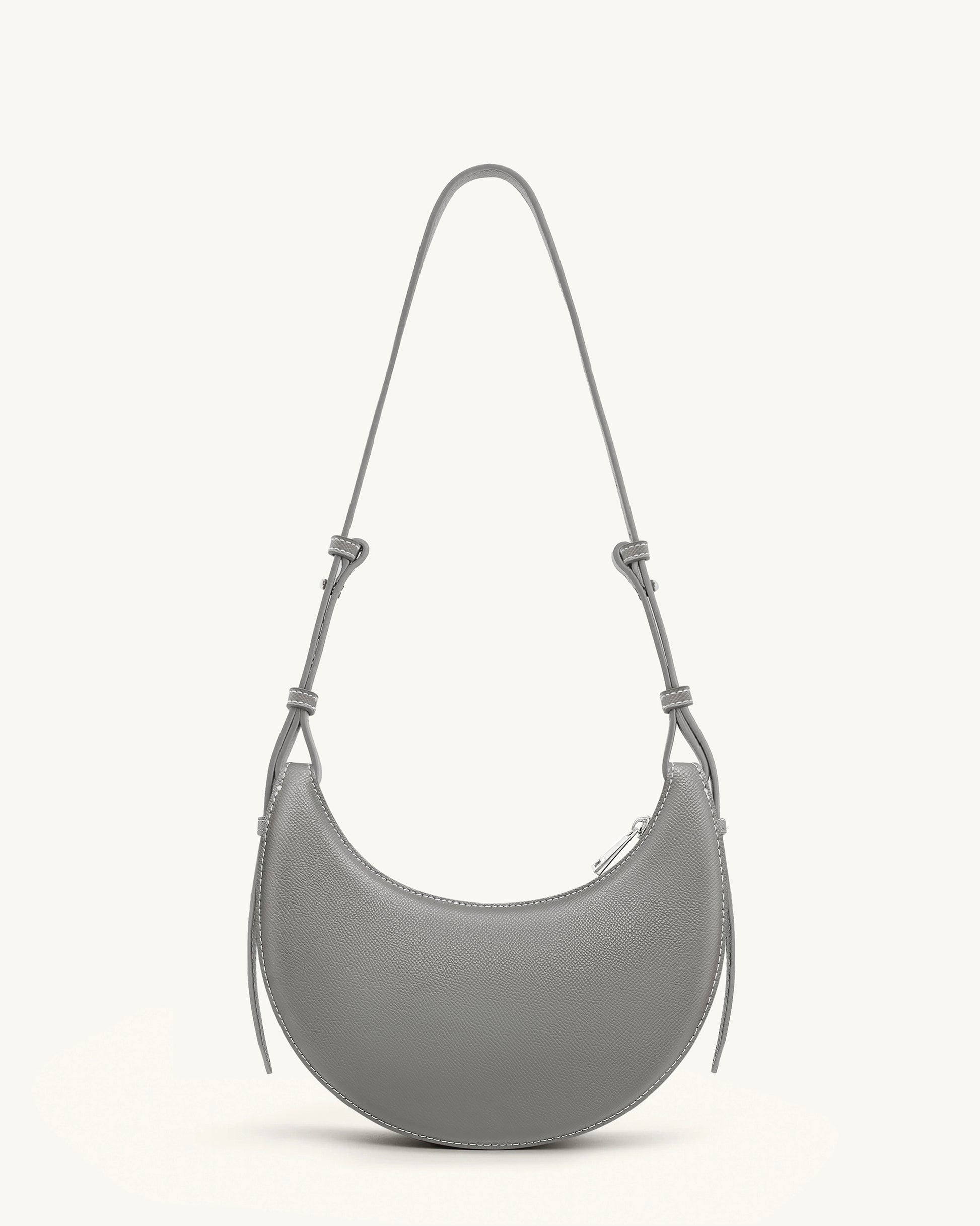 This shoulder bag features a crescent silhouette with textured vegan leather. It has a slip pocket interior and silver-tone hardware. The adjustable strap allows for comfortable shoulder or crossbody wear.