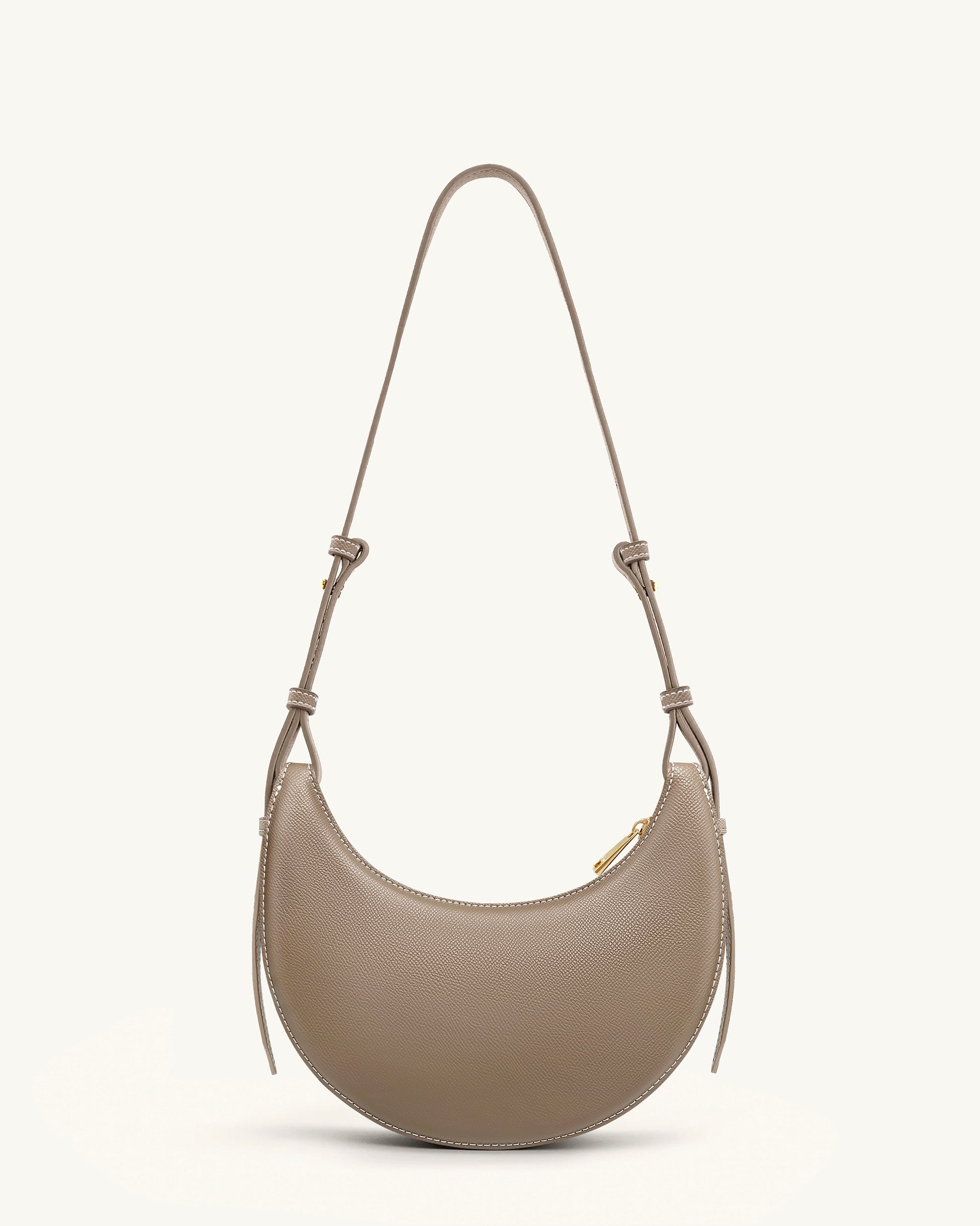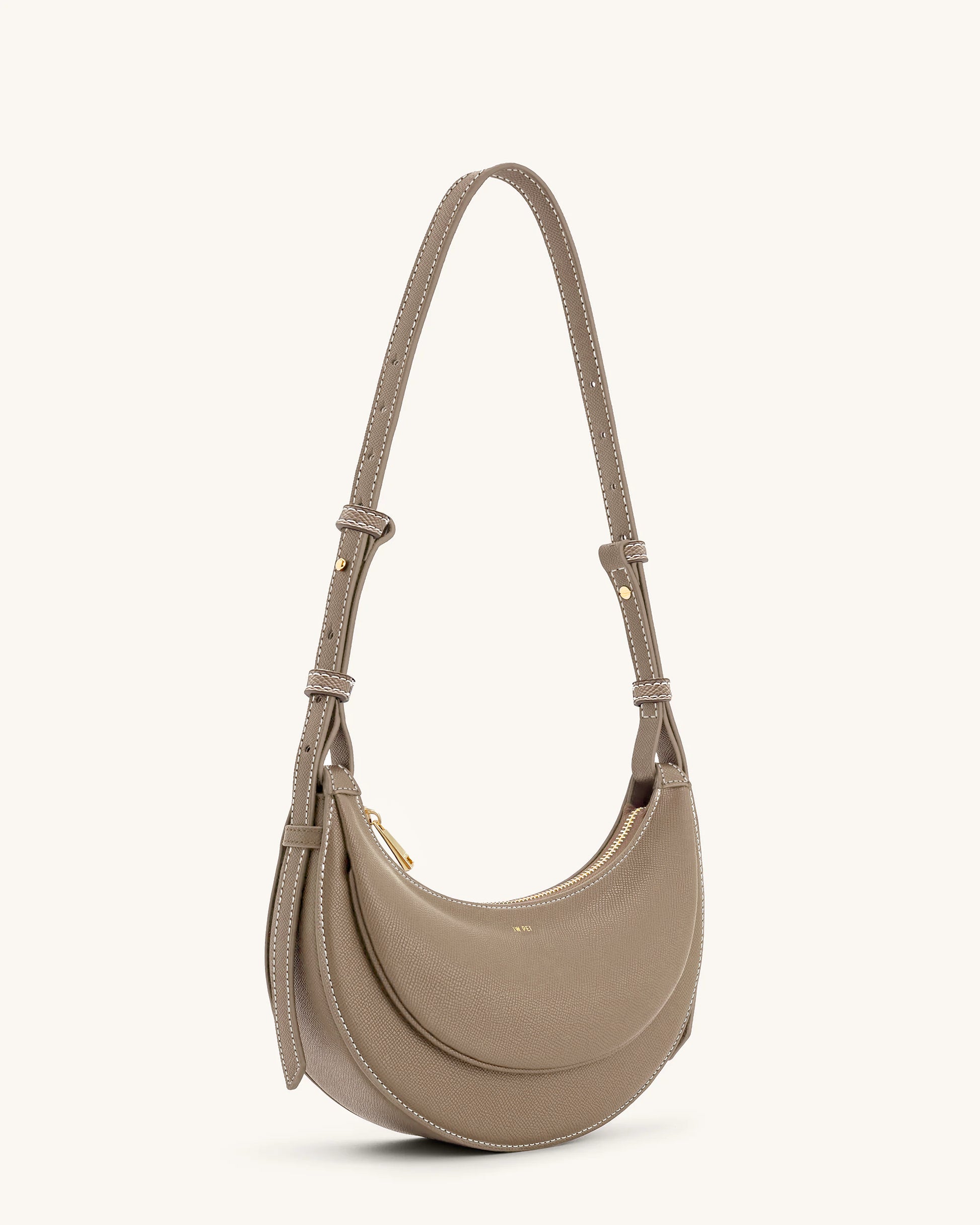 This crescent bag features vegan leather with a palm grain texture. It has a gold-tone zipper and adjustable strap. One interior slip pocket holds essentials. Fits an iPhone 16 Pro Max.