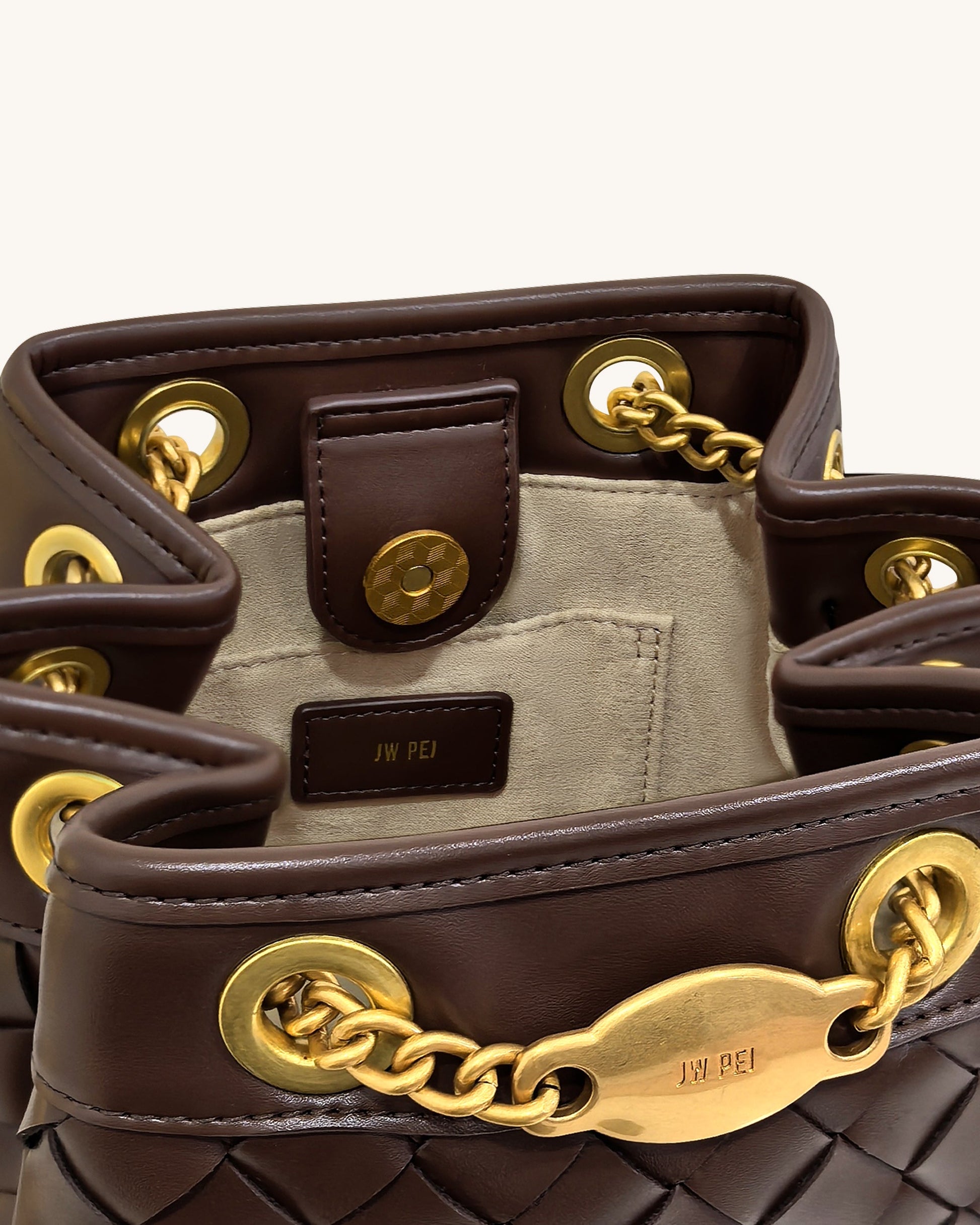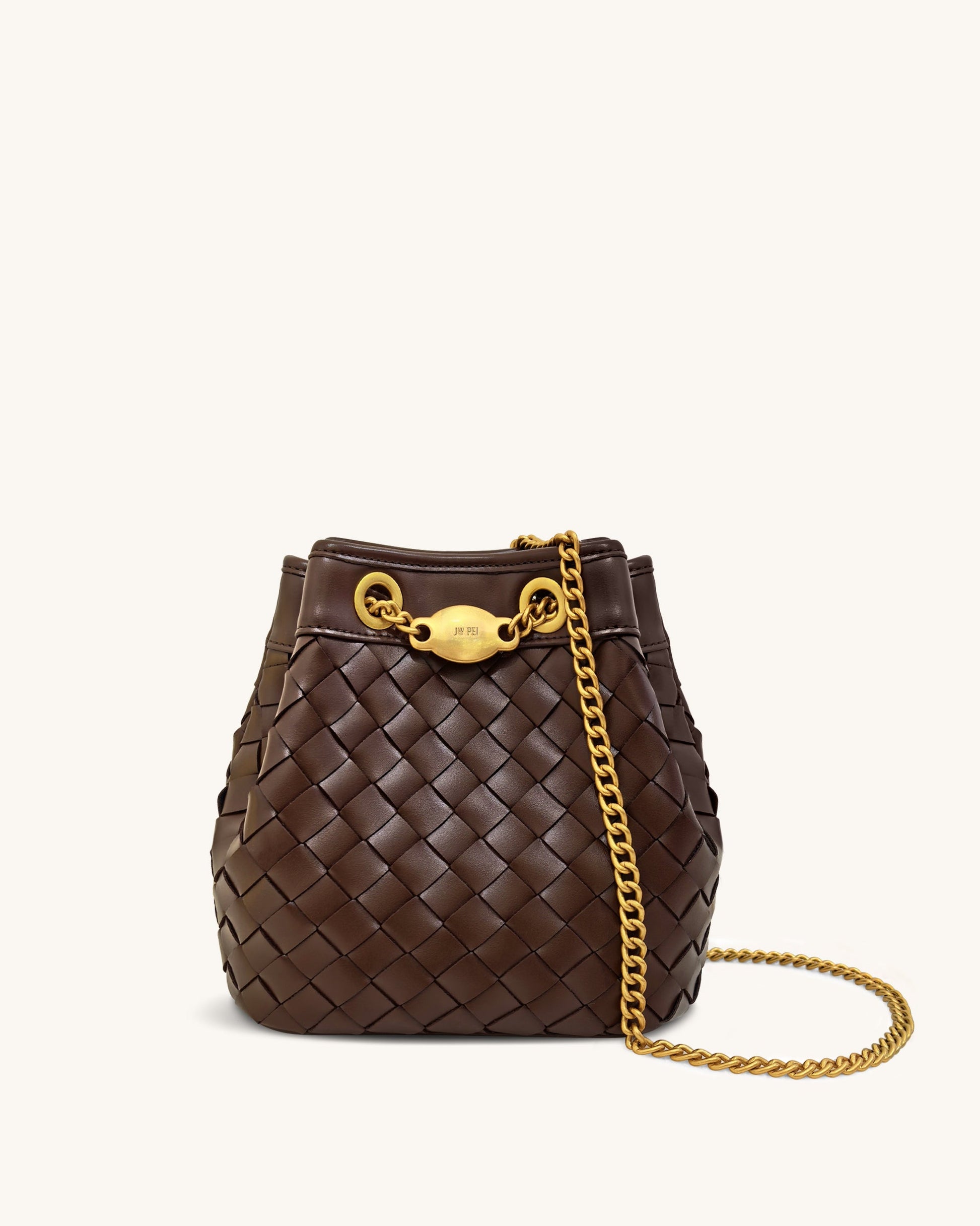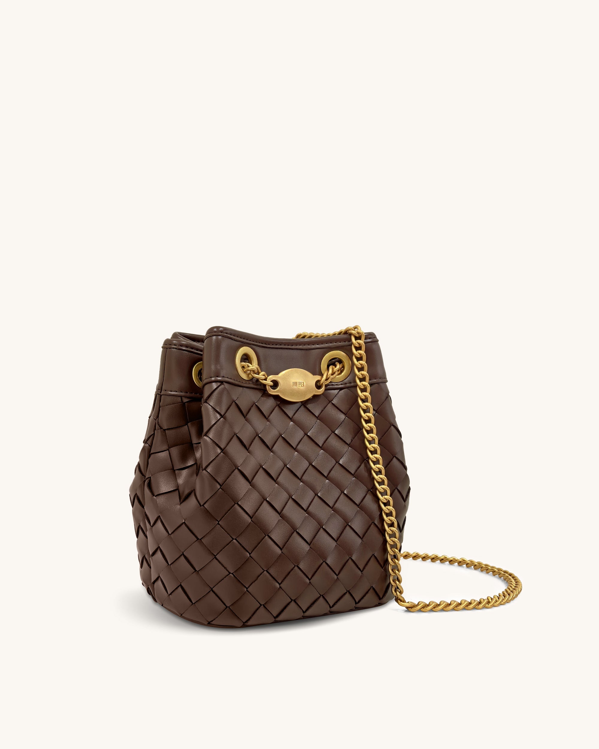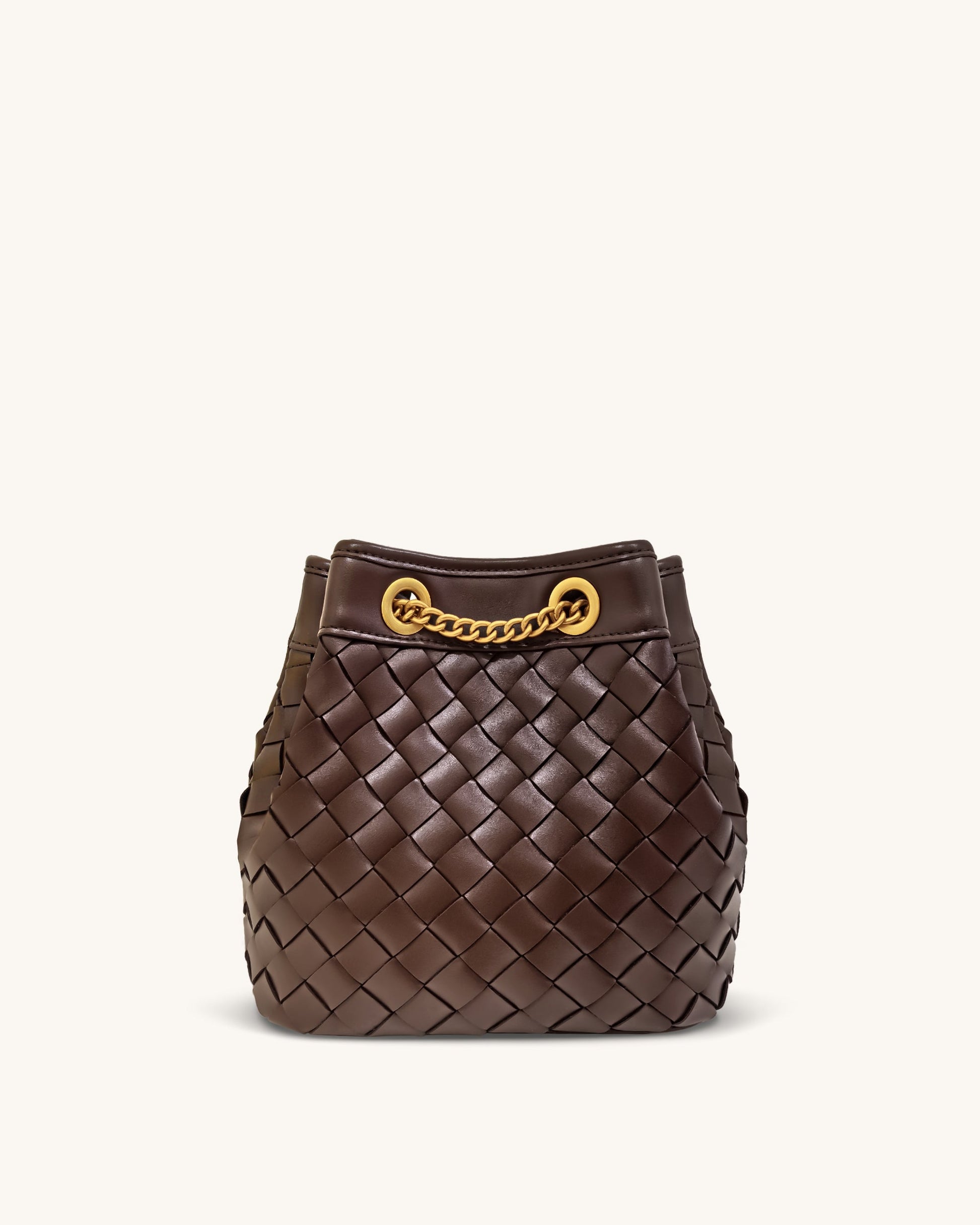 This bag features a deep brown hand-woven design, accented with luxurious gold-tone chain and hardware, exuding an elegant and vintage-inspired charm. The bucket shape offers ample space, combining practicality with distinctive style, perfect for everyday use or casual outings.