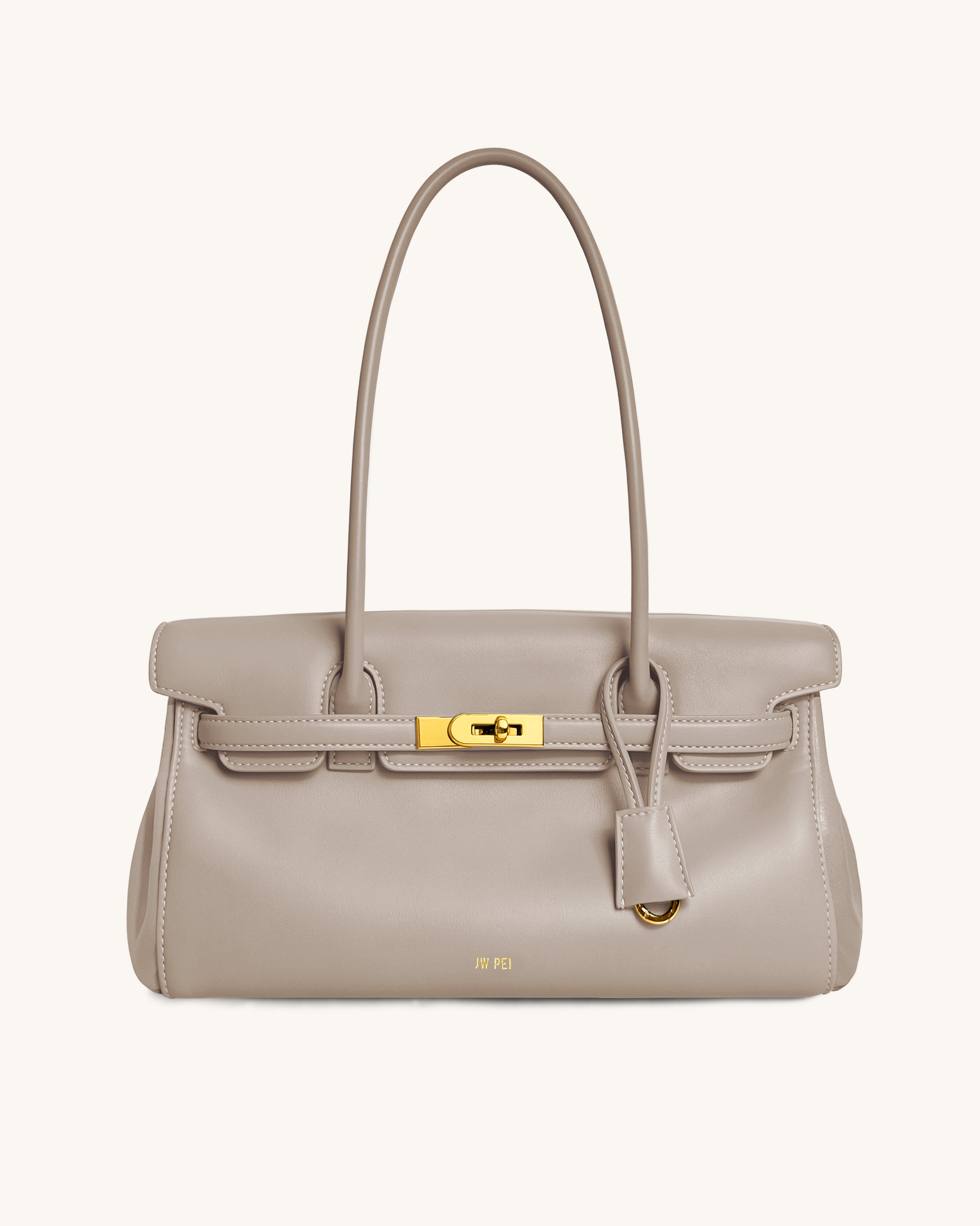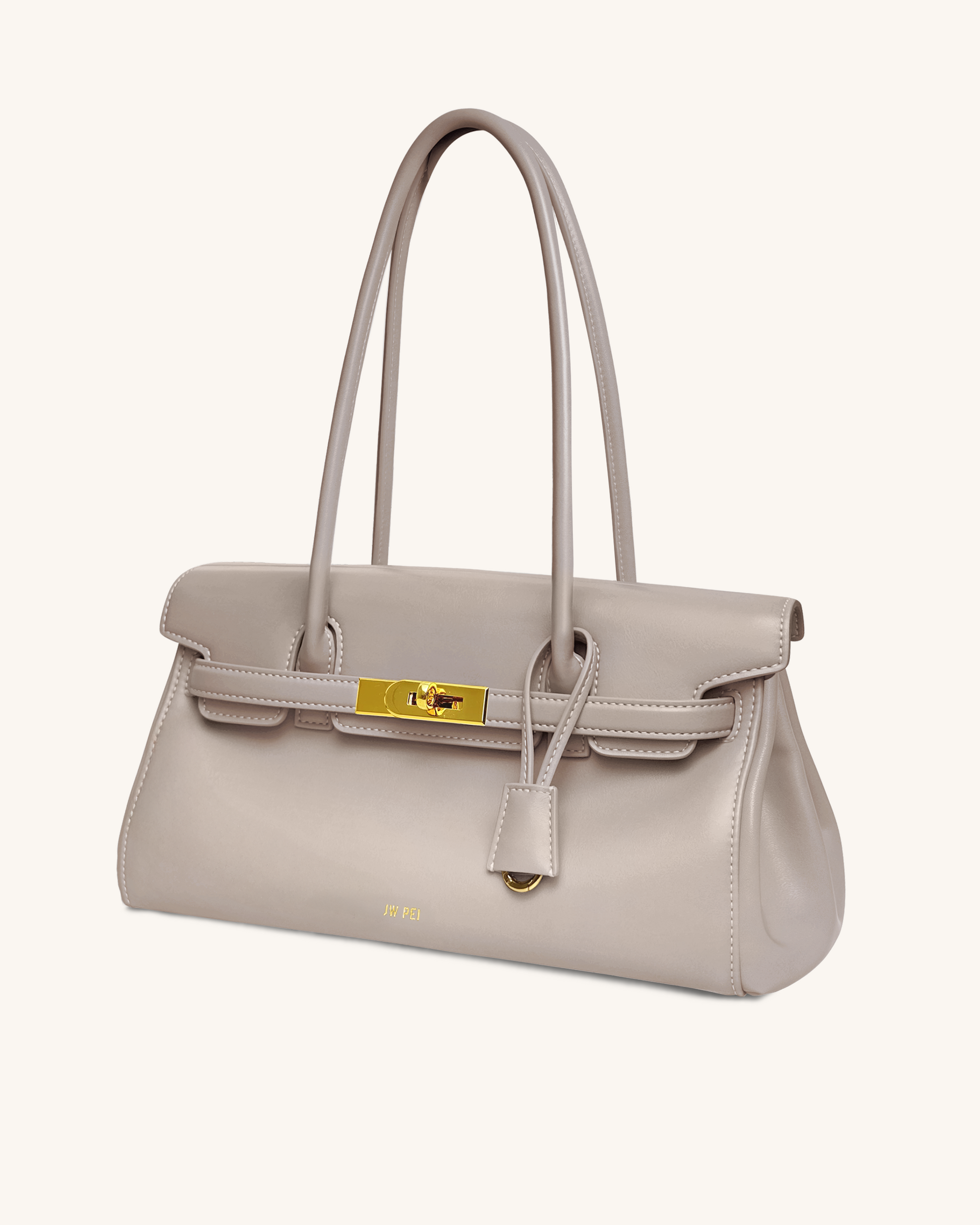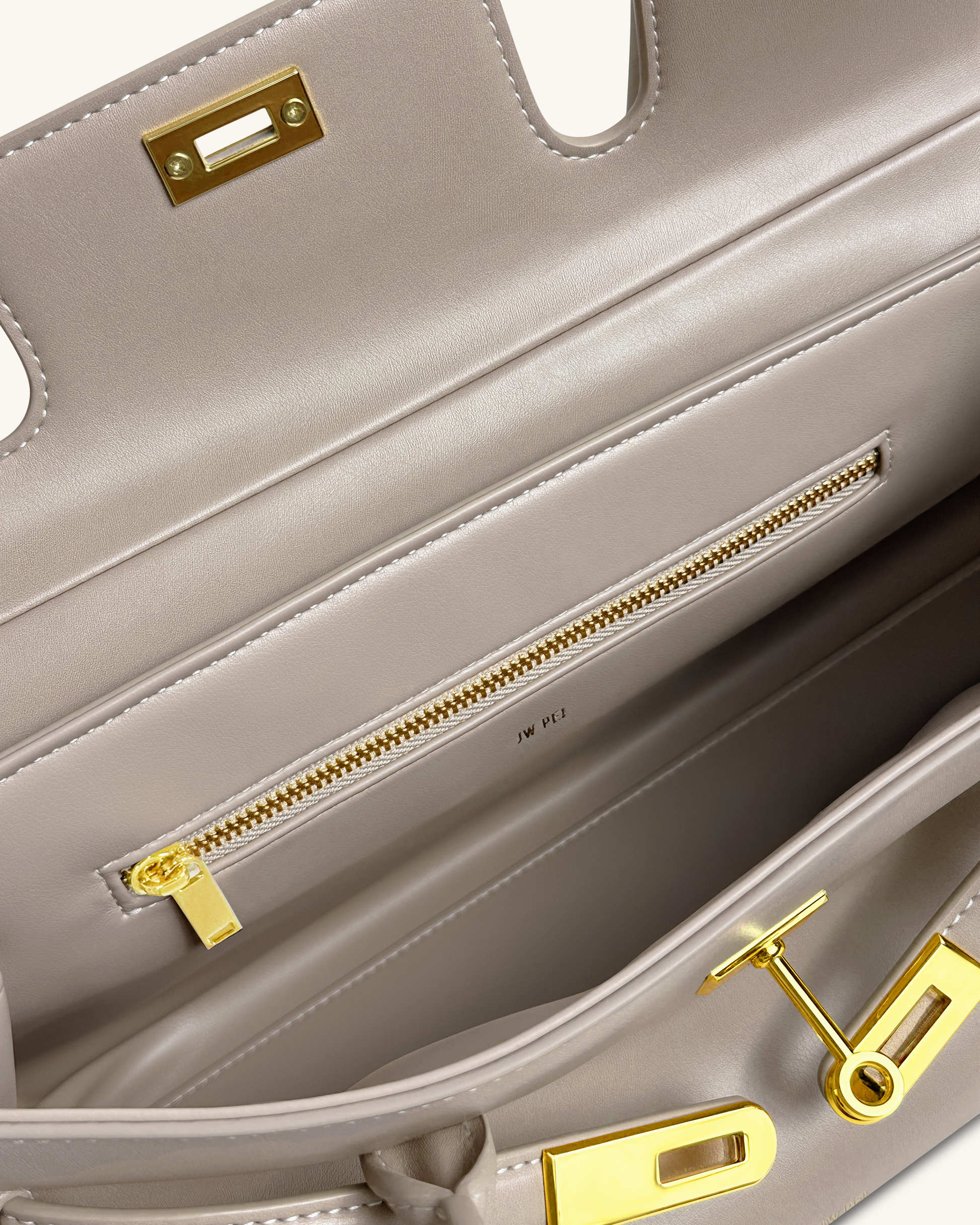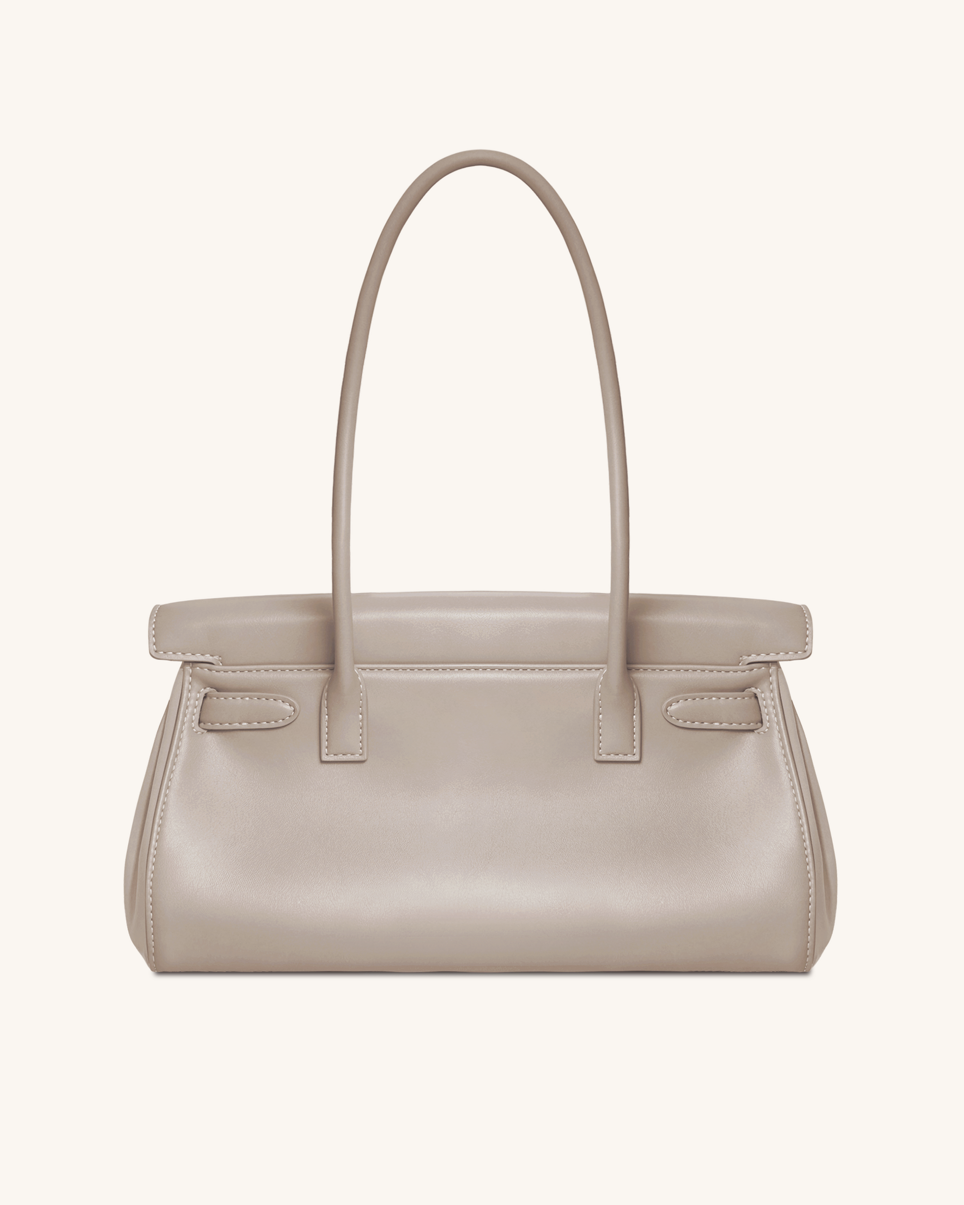 Sophisticated top handle bag in smooth vegan leather with golden hardware. Features a structured silhouette for daily elegance. Designed for handheld and shoulder use. Spacious enough for essentials and a large smartphone.